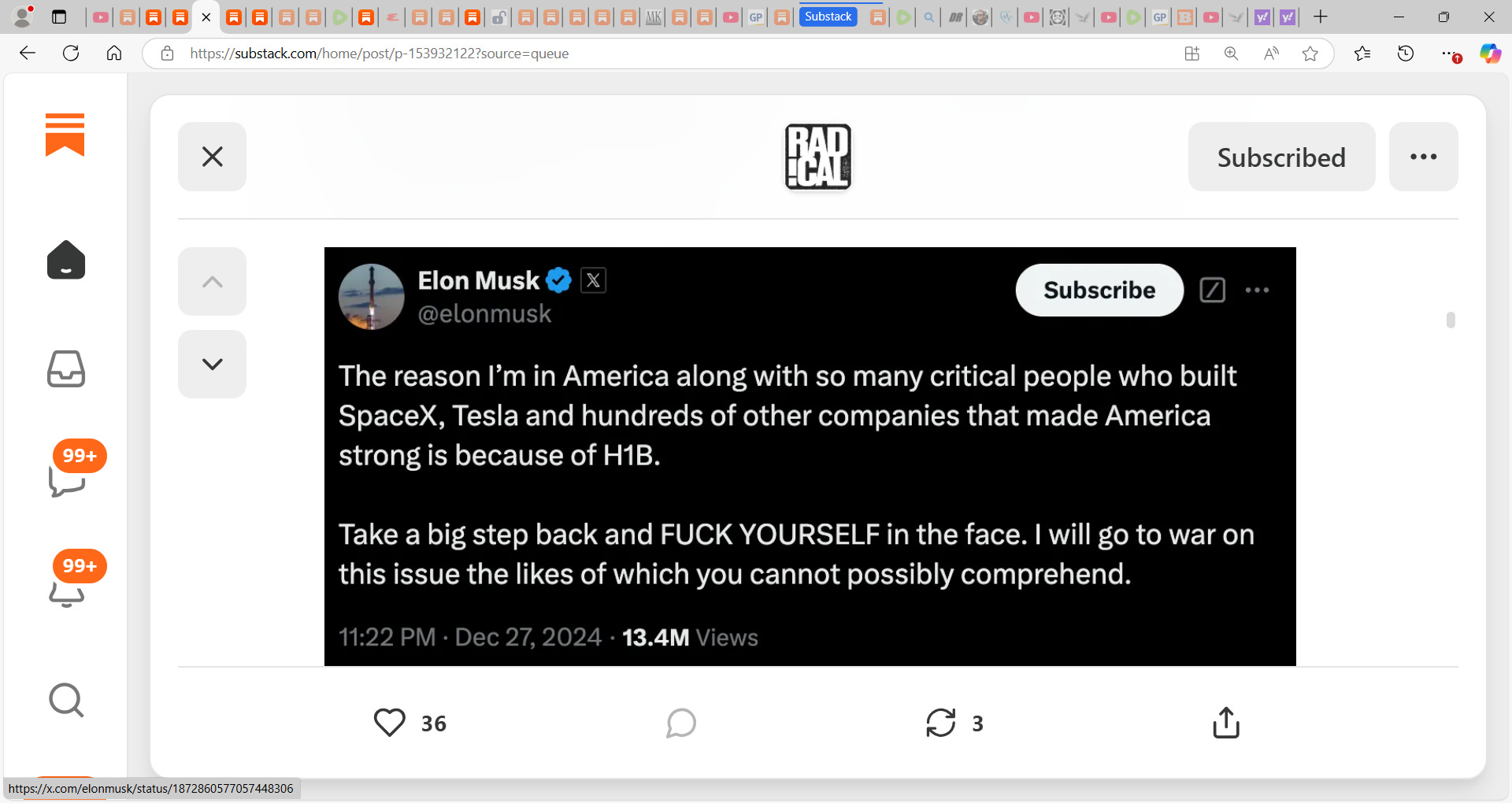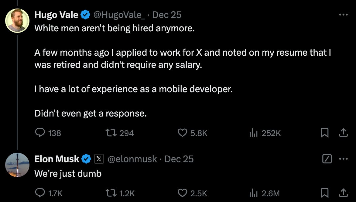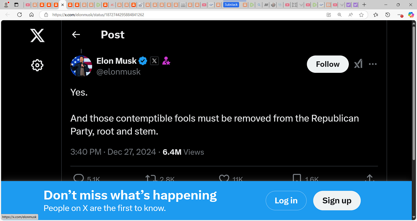 Musk went nuts telling us to fuck ourselves in the face...this South African interloper usurper 'taking our tax money' user...IMO...I like people to know their place...you came and benefitted now want to school us? we would rather you say thank you and do not think you are smarter for you are not Musk. Only daddy T is stroking you so. ask the typical American what they think of you