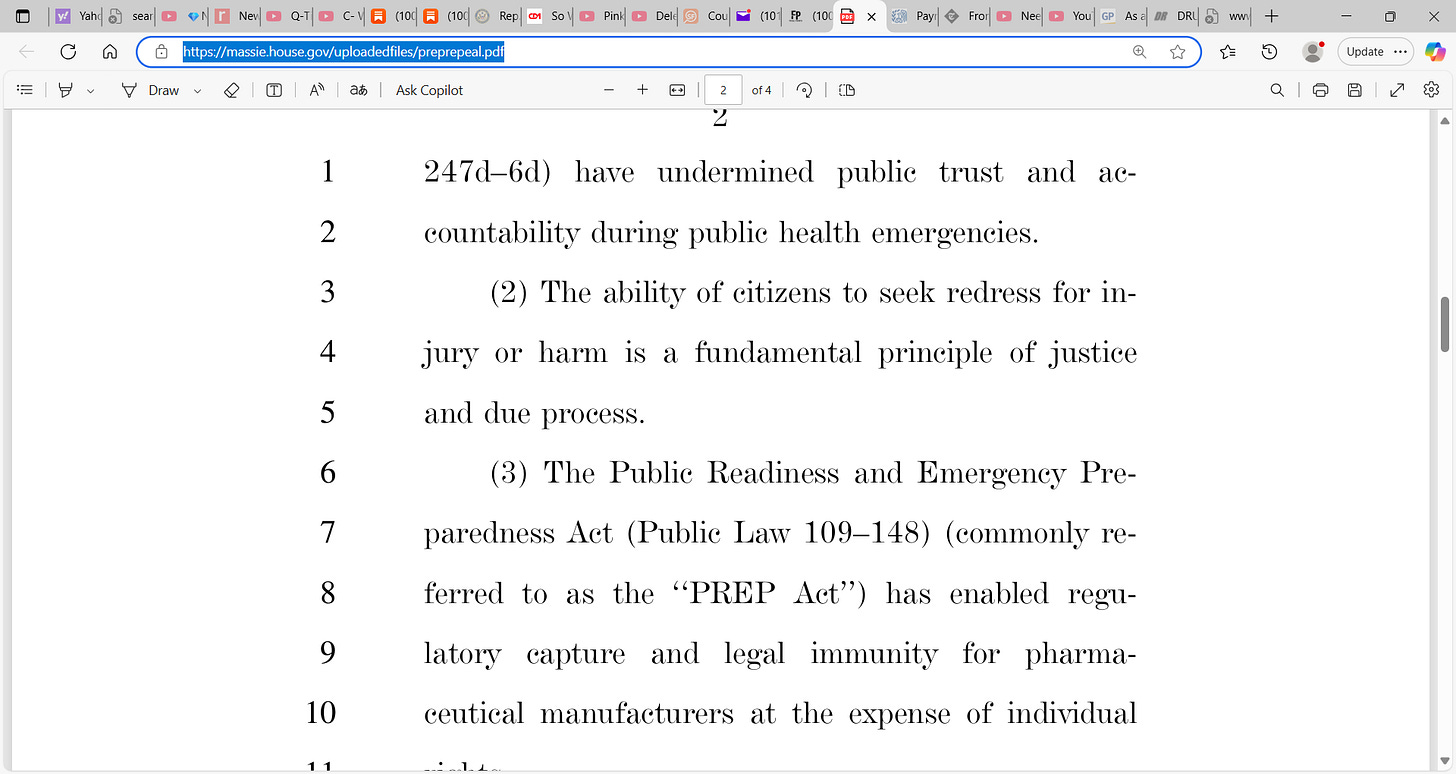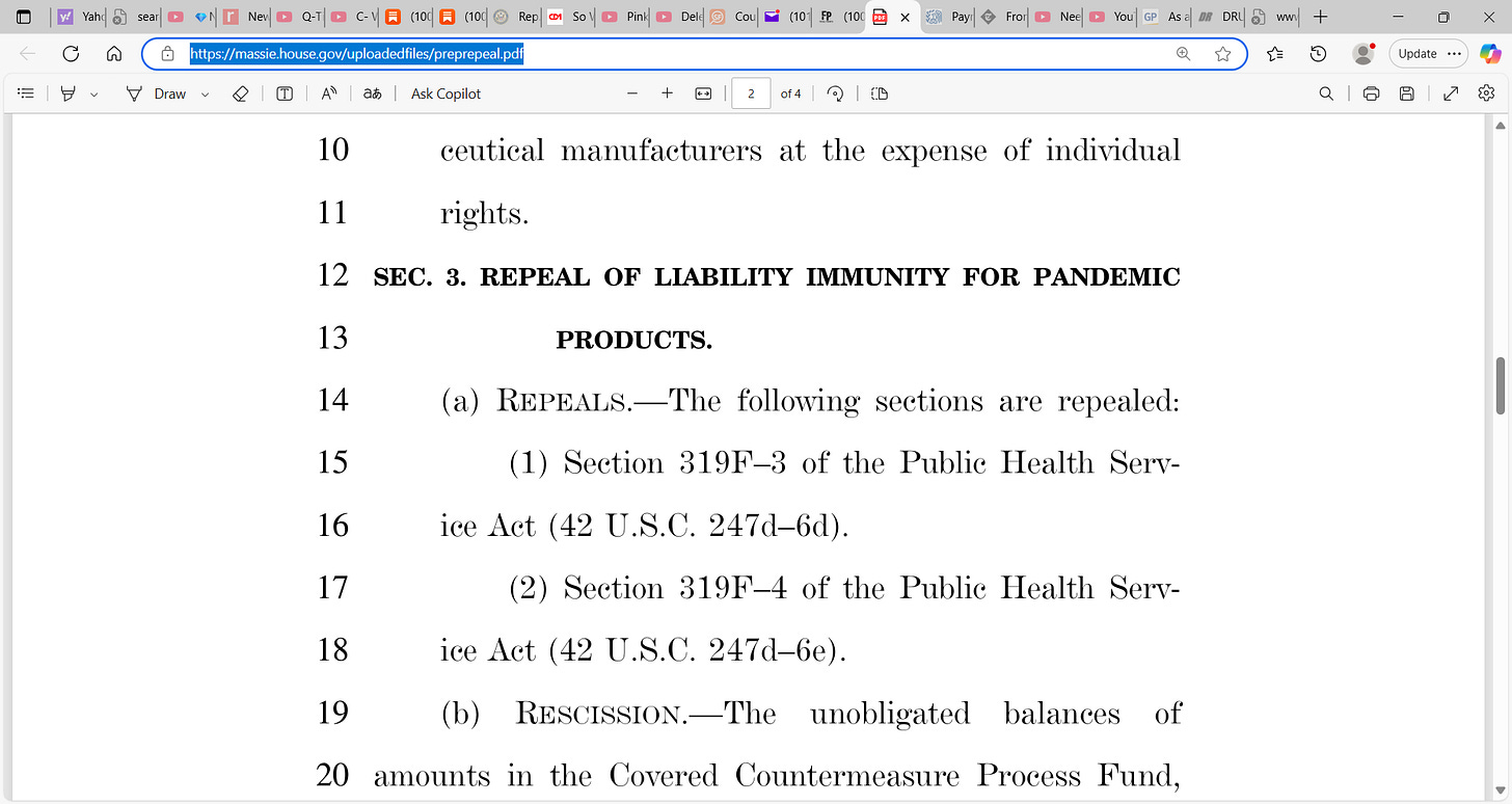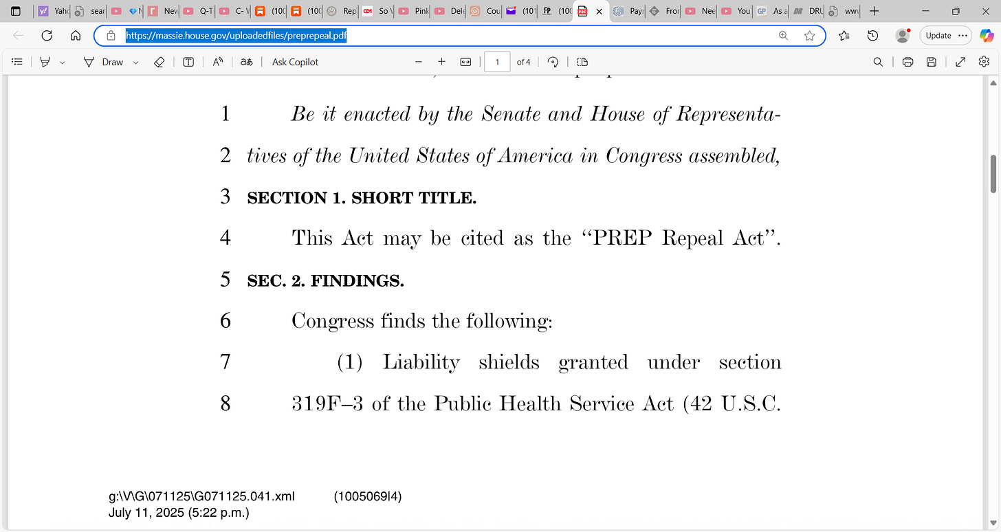 Come on POTUS Trump, give us the American people the fucking right to sue these beasts, help us, at least let us enter courts. Pass this bill. Get it passed, do this for us, at least. We trust you and I still stand with you. Massie is correct! We must end these deadly countermeasures. These ineffective deadly Malone Weissman Sahin et al. mRNA transfection injections inoculations. I support Massie’s PREP Repeal Act 4388. It works to repeal and end Sections 319F–3 and 319F–4 of the Public Health Service Act — in effect ending liability and legal protections for pandemic countermeasures.