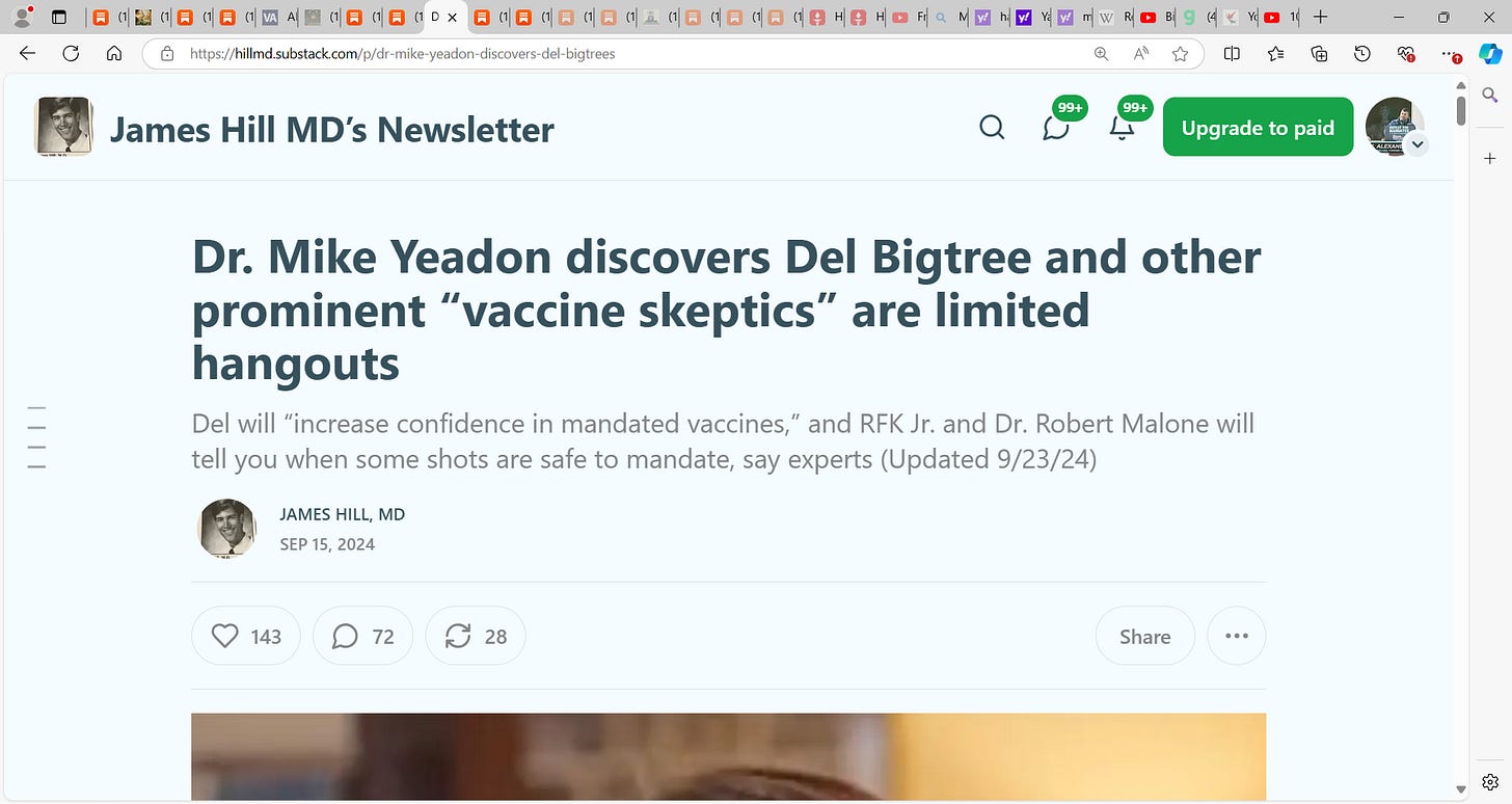Boom! Dr. James Hill, MD drops a MOAB, over target when he writes about his take on Dr. Mike Yeadon (hero of mine): Yeadon "discovers Del Bigtree and other prominent “vaccine skeptics” are limited