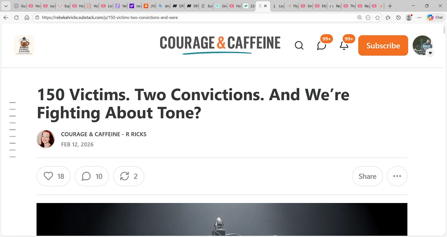 BOOM! exceptional key article on Epstein disaster & truth: "150 Victims. Two Convictions. And We’re Fighting About Tone?" by Courage & Caffeine - R Ricks; One hundred and fifty. Epstein victims so