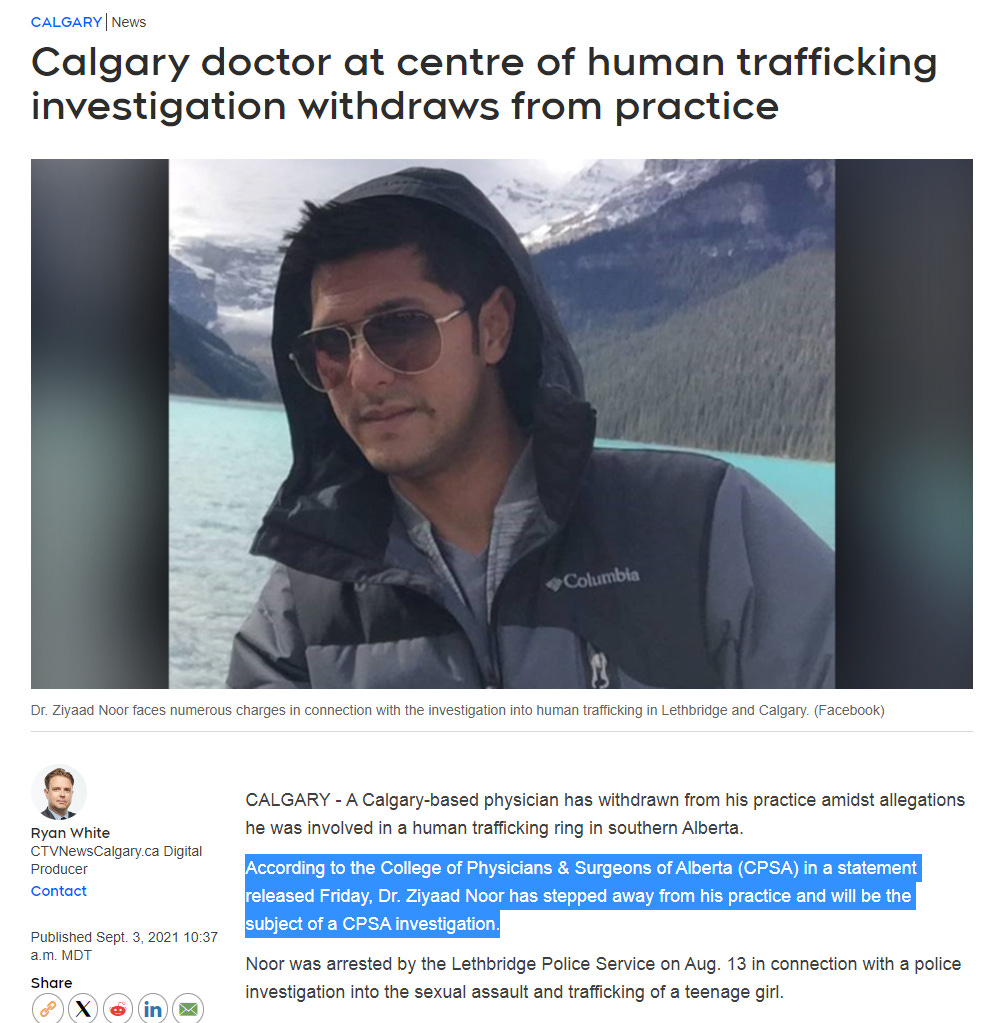 Why is a Calgary doctor Dr. Ziyaad Noor, at the center of a human trafficking investigation? Why did the doctor withdraw from clinical practice? Is the evidence so bullet-proof? If this doctor sexually abused you etc. you must come to the RCMP. Which other doctors in Albera? Which in Ontario?