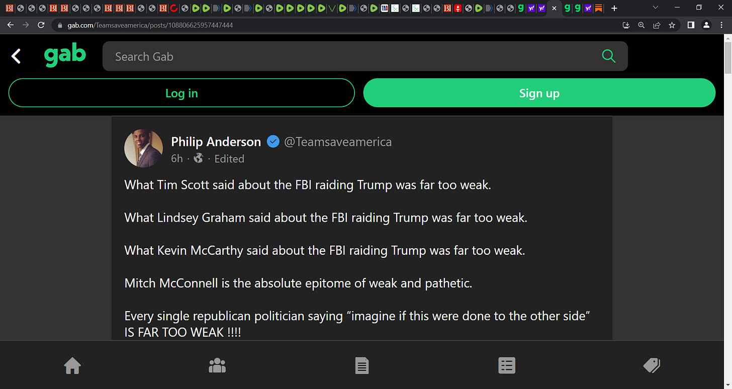 BOOM! Philip Anderson, saying it like it is, yes "What Tim Scott said about FBI raiding Trump was far too weak. What Kevin McCarthy said about FBI raiding Trump was far too weak. Mitch McConnell is