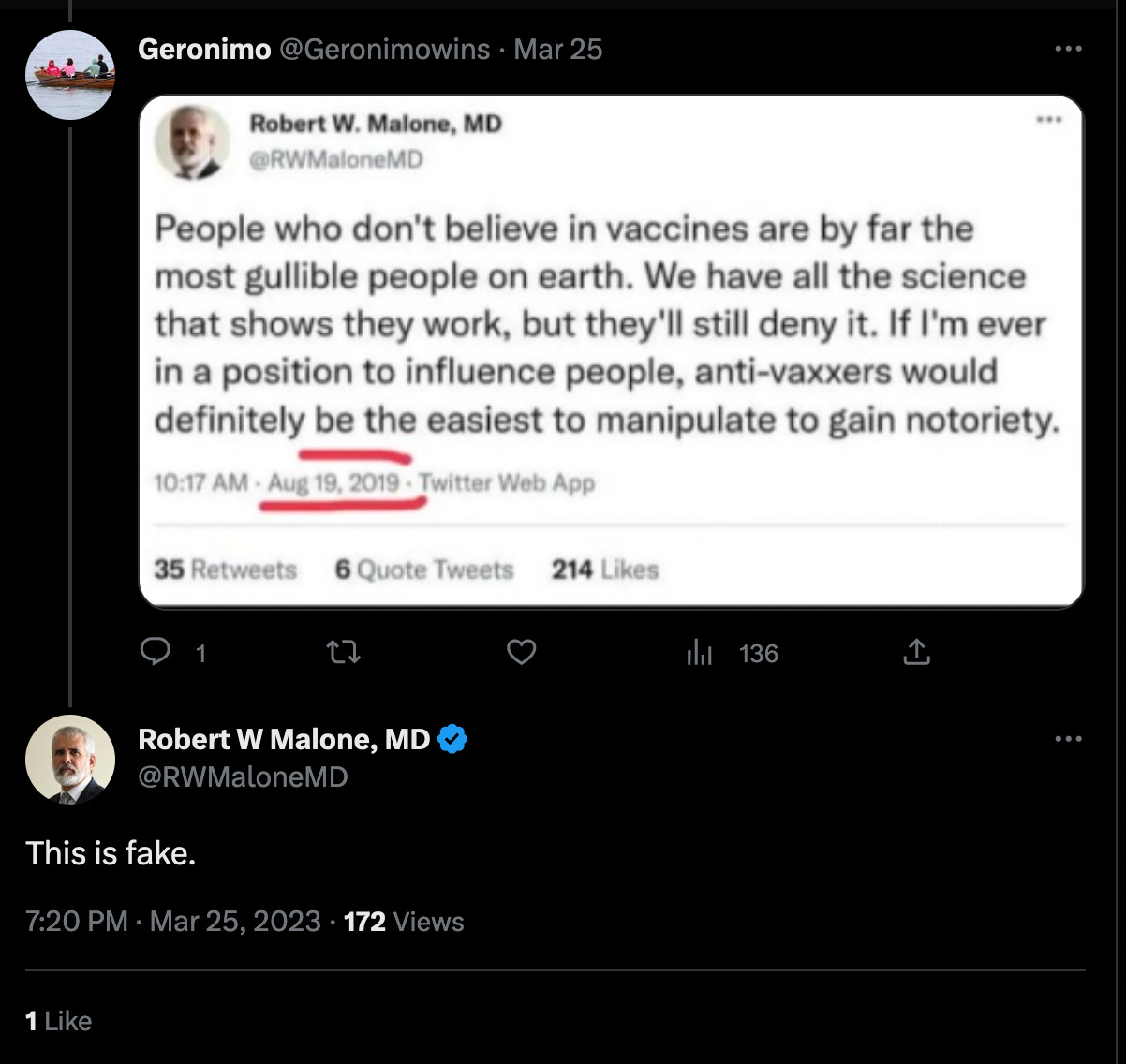 Dr. Malone replied to me yesterday in Meryl Nass's substack, correcting me on him never having worked for DARPA. I listed 3 damning articles on him and asked if the facts in those we also "fake" and he dared not reply. That spoke volumes.
