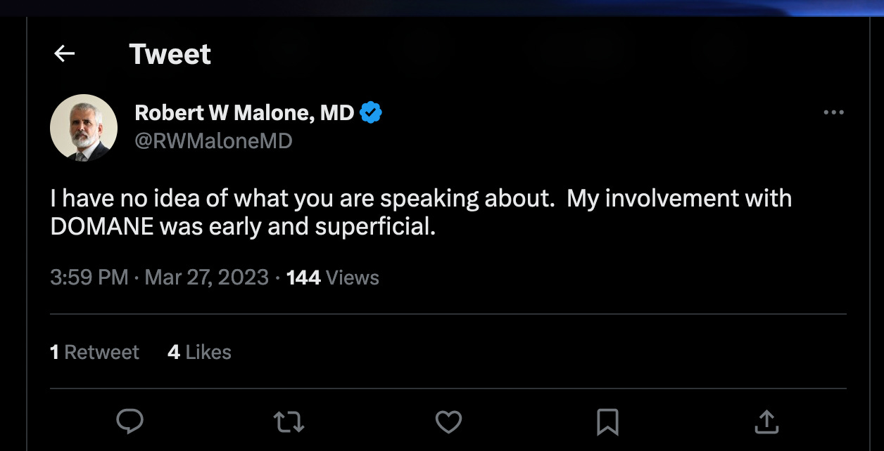 Dr. Malone says his involvement with DOMANE was early and superficial.