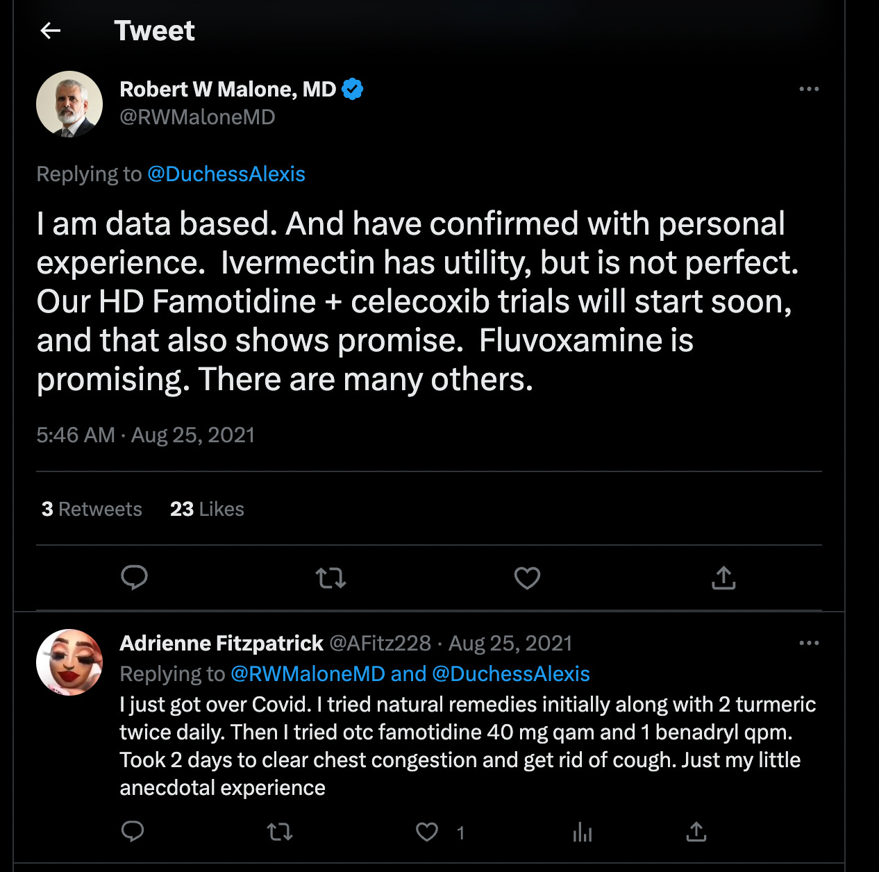 Malone coauthored and submitted a couple of manuscripts on famotidine, a stomach acid drug sold under the brand name Pepcid. As former chief medical officer of Alchem Laboratories Corporation, Malone has previously been involved in work on famotidine: in April 2020, Alchem and its subcontractor Northwell Health were awarded a $20.7-million government contract to test the drug in combination with hydroxychloroquine in patients with moderate to severe COVID-19, the Associated Press reported last summer.