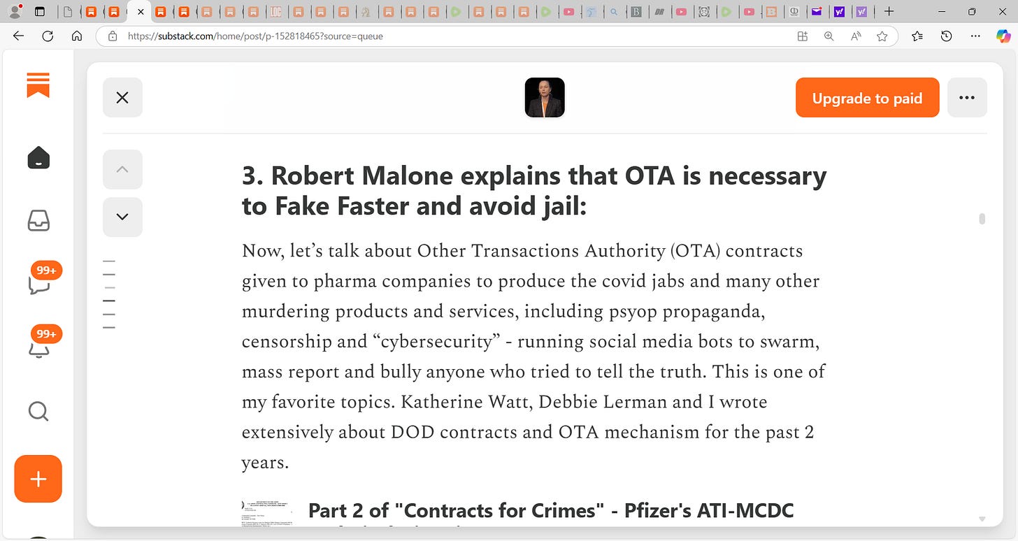 Now, let’s talk about Other Transactions Authority (OTA) contracts given to pharma companies to produce the covid jabs and many other murdering products and services, including psyop propaganda, censorship and “cybersecurity” - running social media bots to swarm, mass report and bully anyone who tried to tell the truth. This is one of my favorite topics. Katherine Watt, Debbie Lerman and I wrote extensively about DOD contracts and OTA mechanism for the past 2 years.