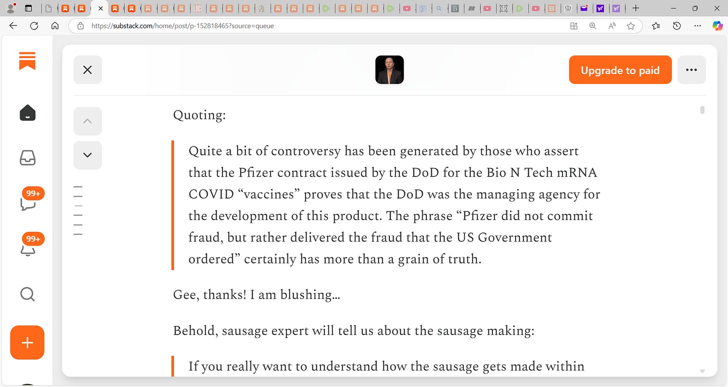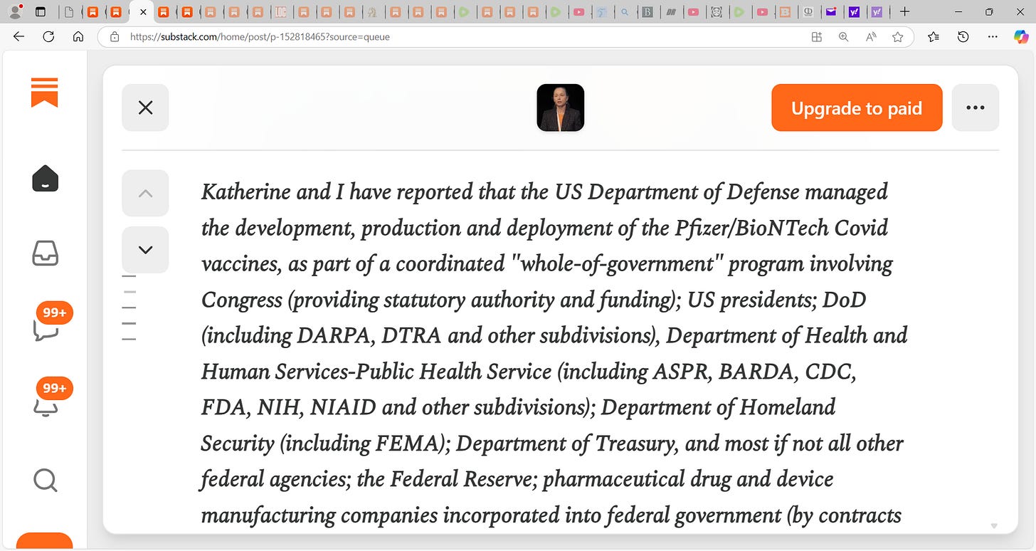 Now, does that mean that DoD was entirely passive in the development of the mRNA “vaccine” products? Absolutely not. Months after EUA “authorization” of the Pfizer and Moderna products, I got a call out of the blue from an old colleague that I had worked with on the Ebola vaccine development project that I had spearheaded for another client - New Link Genetics. This was the vaccine that was later sold to Merck and FDA authorized for Ebola (Zaire) prophylaxis. The colleague in question had been an Army Lieutenant Colonel at the time, and I had provided some mentoring to him way back when. He had subsequently moved on to Army logistics and acquisition, but because of his Ebola vaccine development experience had been reassigned on short notice to project manage the Moderna vaccine project for OWS. He seemed to need to unburden himself about what he had seen and experienced, and about the frustration of having to project manage a diverse multi-agency group tasked with managing the Moderna project - which had (at least in part) originated at the NIH/NIAID Vaccine Research Center. Point being that yes, a DoD Army Colonel was placed as project manager for OWS/Moderna, but it was a thankless task with little power - essentially a multi-agency cat herding task. Not a process unilaterally driven by DoD, in contrast to the uninformed theories of Watt and Latypova.