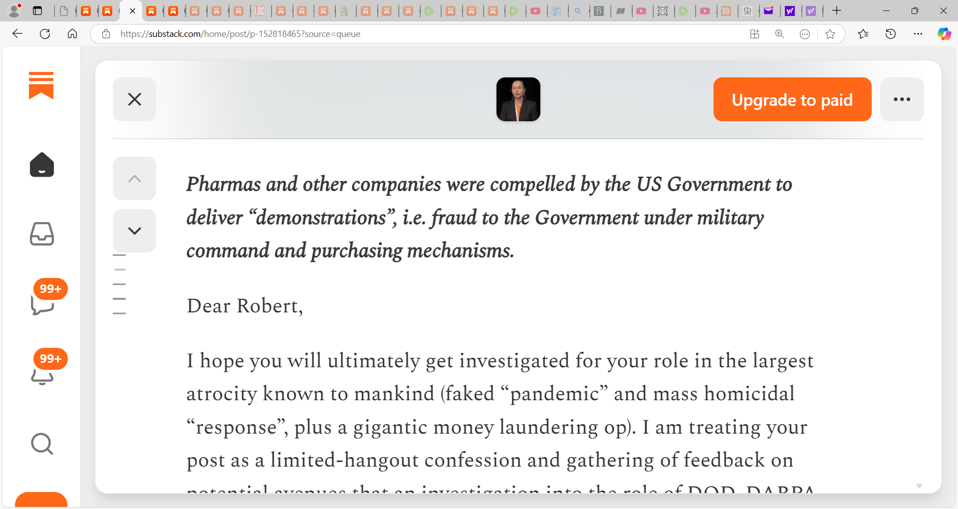 I hope you will ultimately get investigated for your role in the largest atrocity known to mankind (faked “pandemic” and mass homicidal “response”, plus a gigantic money laundering op). I am treating your post as a limited-hangout confession and gathering of feedback on potential avenues that an investigation into the role of DOD, DARPA, DTRA, BARDA and related players, such as yourself, may take.