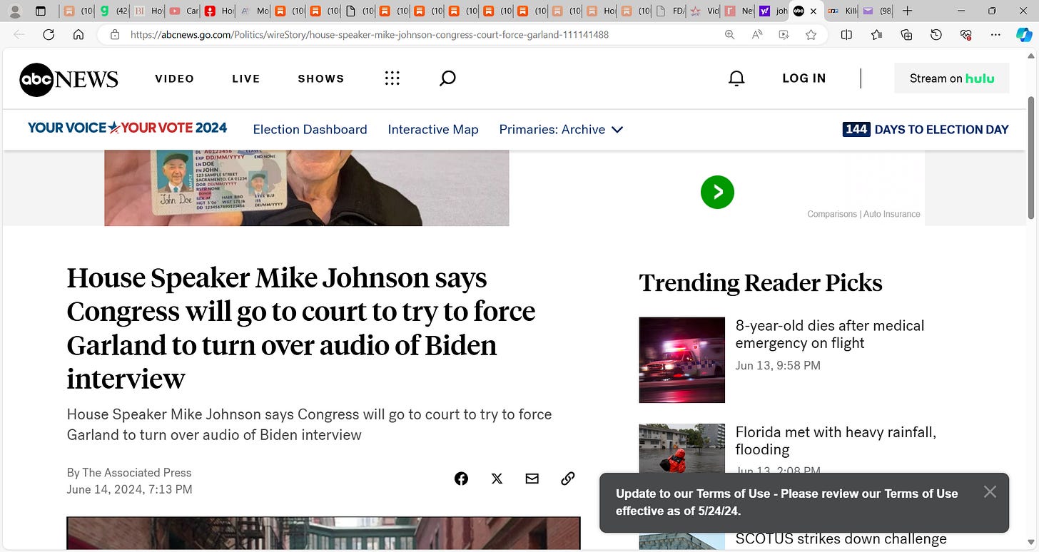 BOOM, speaker Johnson grows some stones, going after Garland to get that video of Biden in serious decline...good, lets see how Biden behaved...my sense is that it does not look good for Biden.