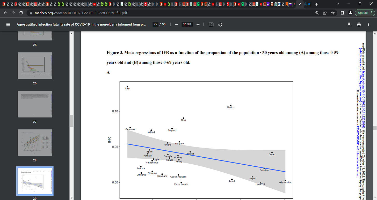 Consistent with these estimates, meta-regressions suggest IFR estimates in that range for the global population where 87% of the 0-59 years old people are <50 years old and 80% of the 0-69 years old people are <50 years old.
