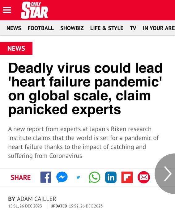 Awake shares: “This has been true for all strains up to now. It was always known that a tsunami of heart failure would afflict those who caught "COVID-19." However, note the articles at the second and third links below. TPTB are trying to make out that the coming heart failure pandemic among those who have had covid will have been caused by the new JN.1 variant.”