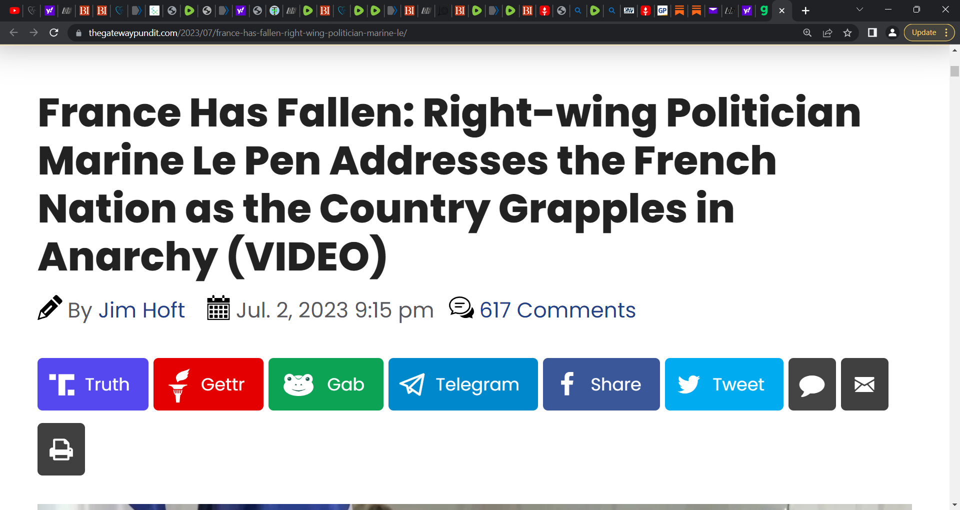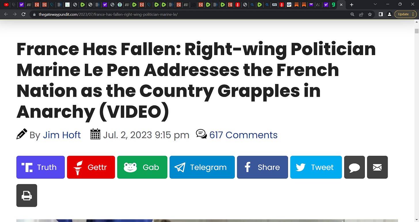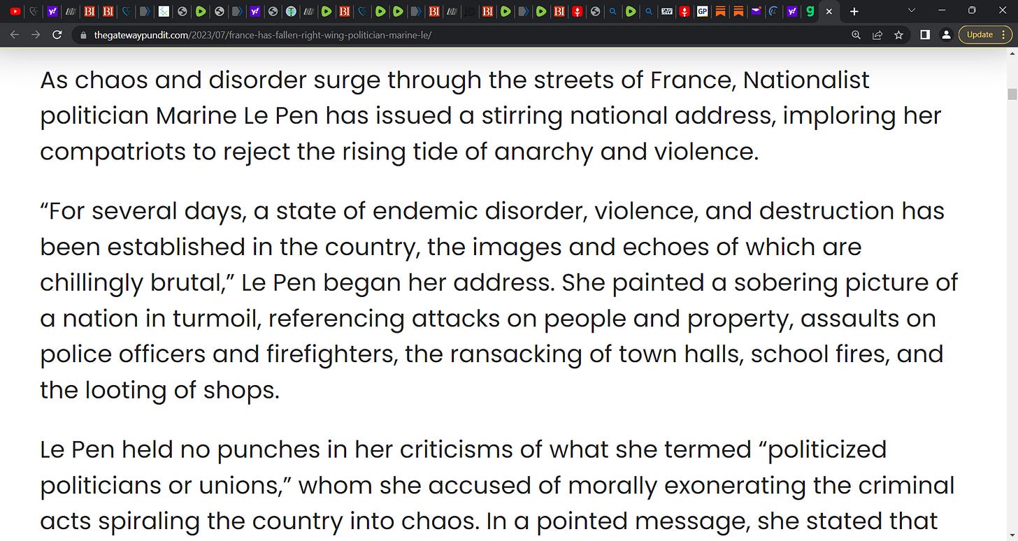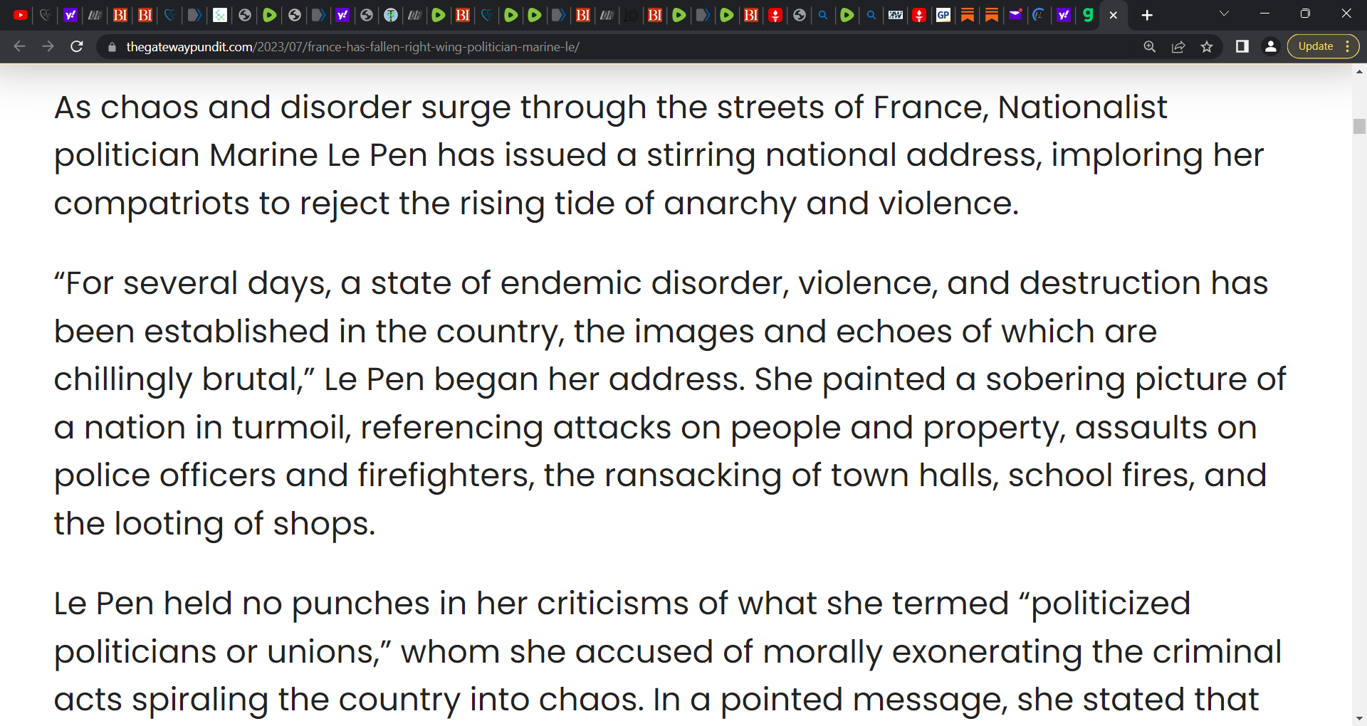 painted a sobering picture of a nation in turmoil, referencing attacks on people and property, assaults on police officers; IMO the solution, secure your French borders, remove all islamists