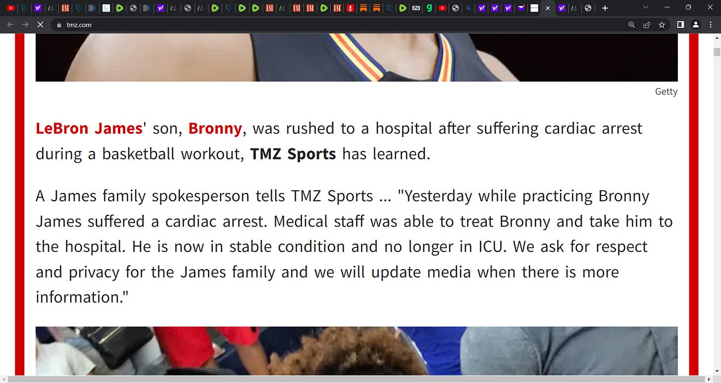 BREAKING: LeBron James's son Bronny James (18 years old) suffers cardiac arrest during USC basketball practice **cough cough DAMAR Hamlin **cough cough JAMIE Foxx etc. etc.; what do we know? Not much!