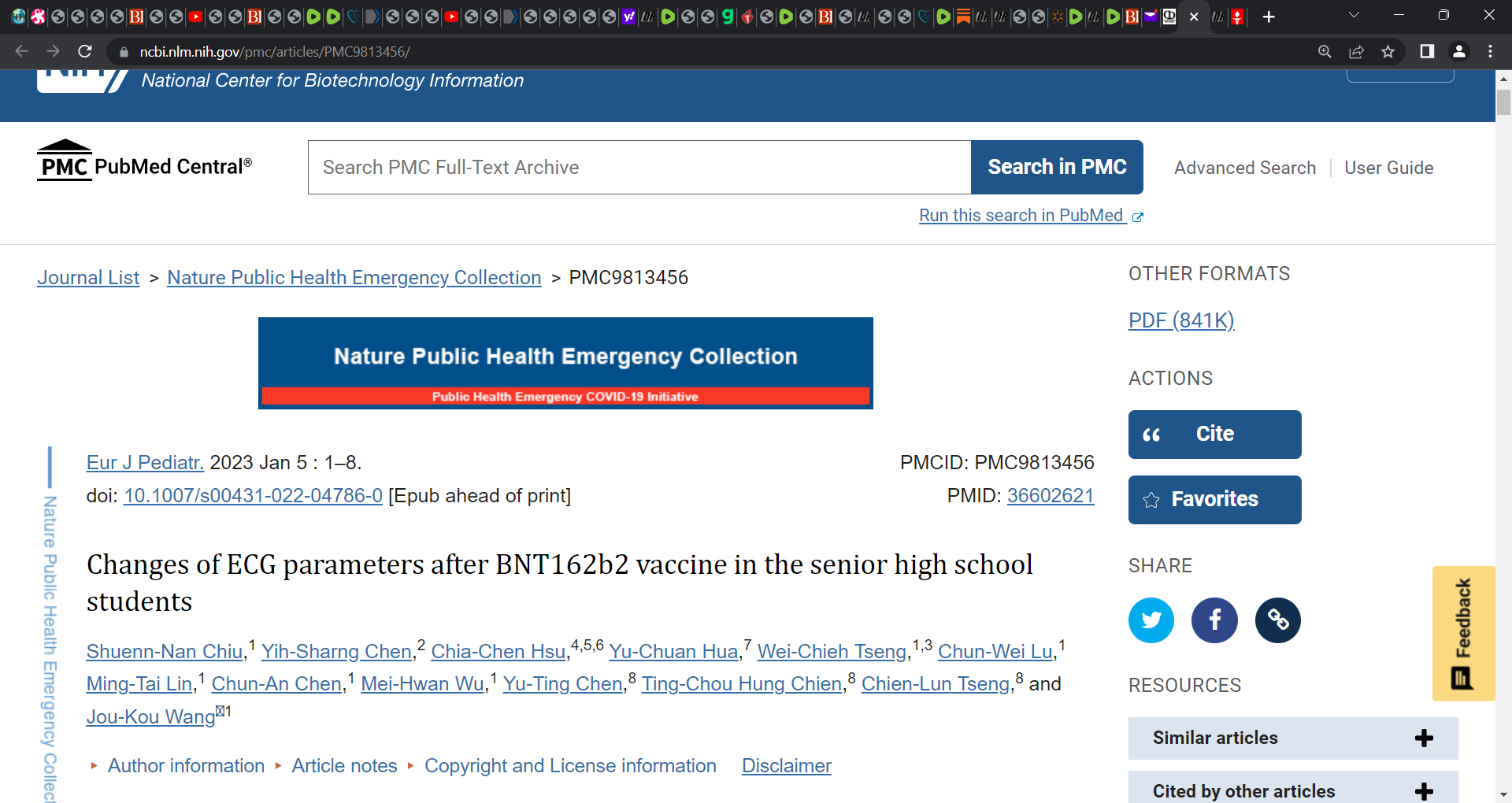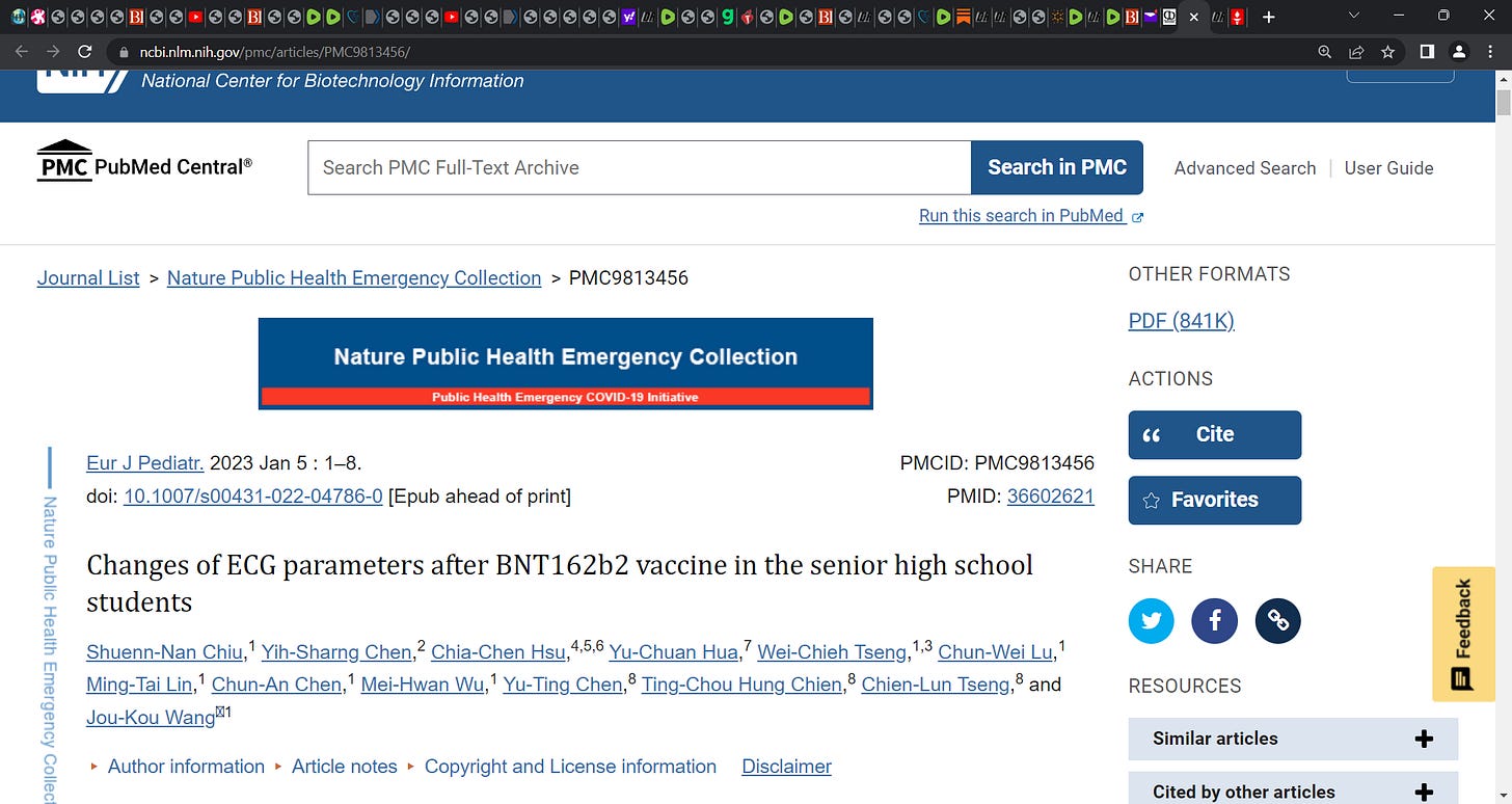 Chiu SN, Chen YS, Hsu CC, Hua YC, Tseng WC, Lu CW, Lin MT, Chen CA, Wu MH, Chen YT, Chien TH, Tseng CL, Wang JK. Changes of ECG parameters after BNT162b2 vaccine in the senior high school students. Eur J Pediatr. 2023 Jan 5:1–8. doi: 10.1007/s00431-022-04786-0. Epub ahead of print. PMID: 36602621; PMCID: PMC9813456.