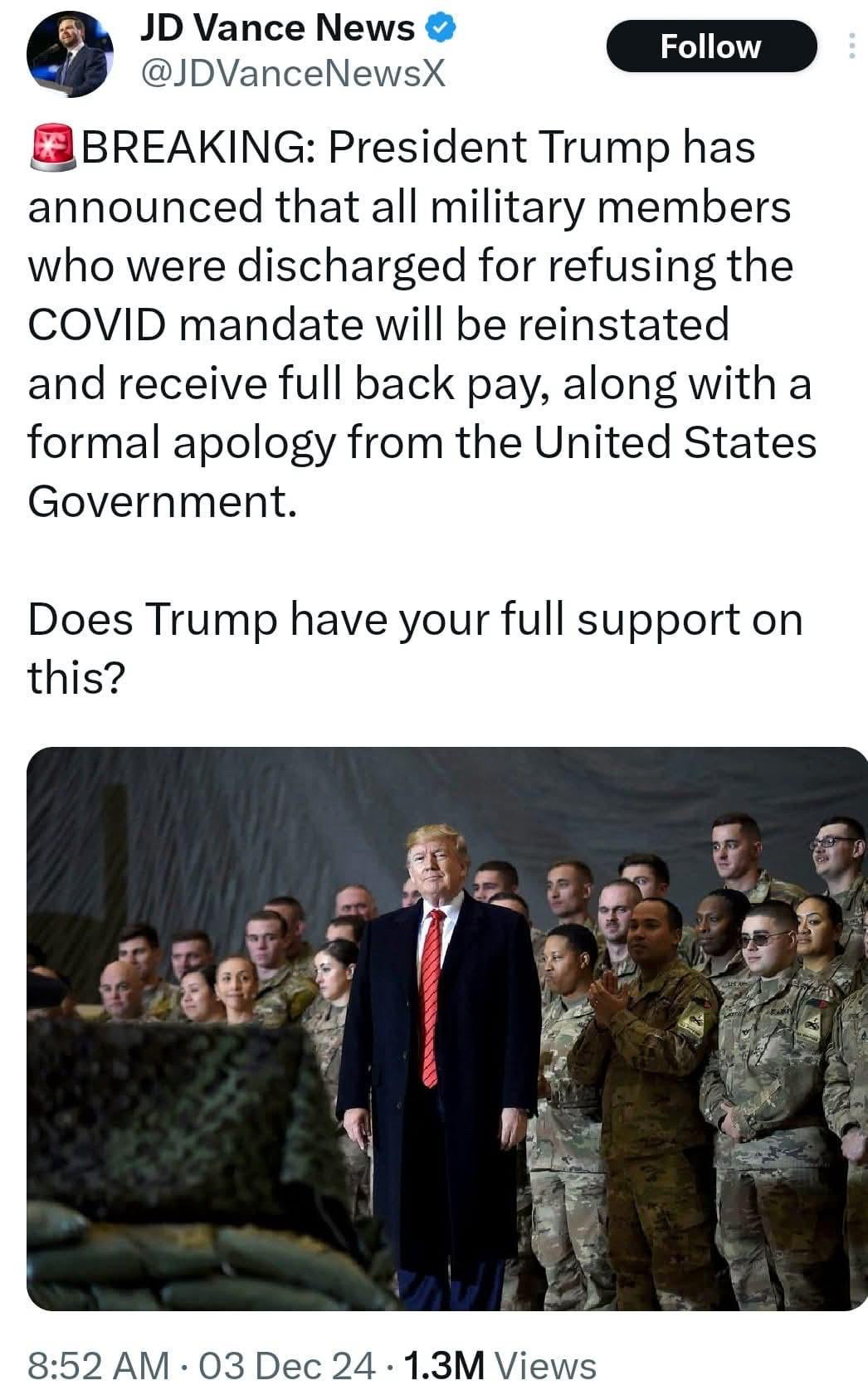 Breaking: POTUS Donaldos Magnus Trumpos aka 47 says all military (8,000 purged by Biden) who were discharged for not taking deadly Malone Bancel et al. mRNA vaccine will be re-instated full back pay