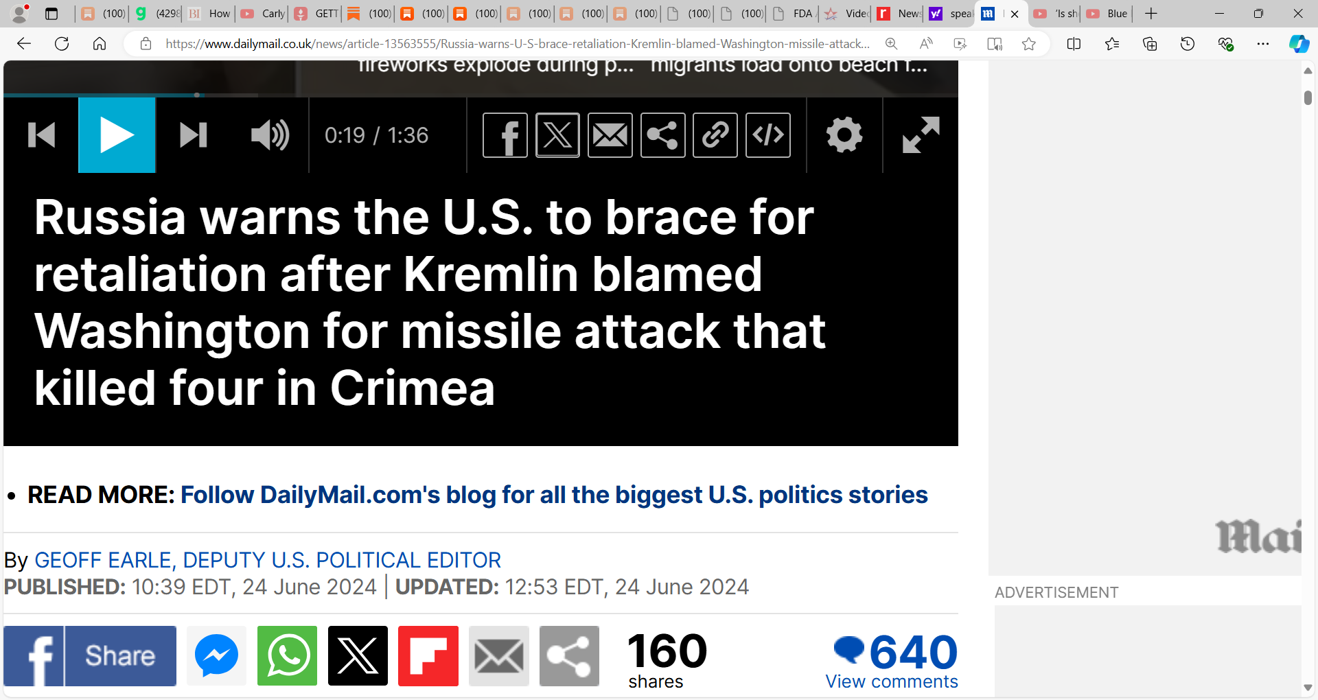 Breaking: Russia warns the U.S. to brace for retaliation after Kremlin blamed Washington for missile attack that killed four in Crimea; The Kremlin has accused the U.S. of 'killing Russian children'