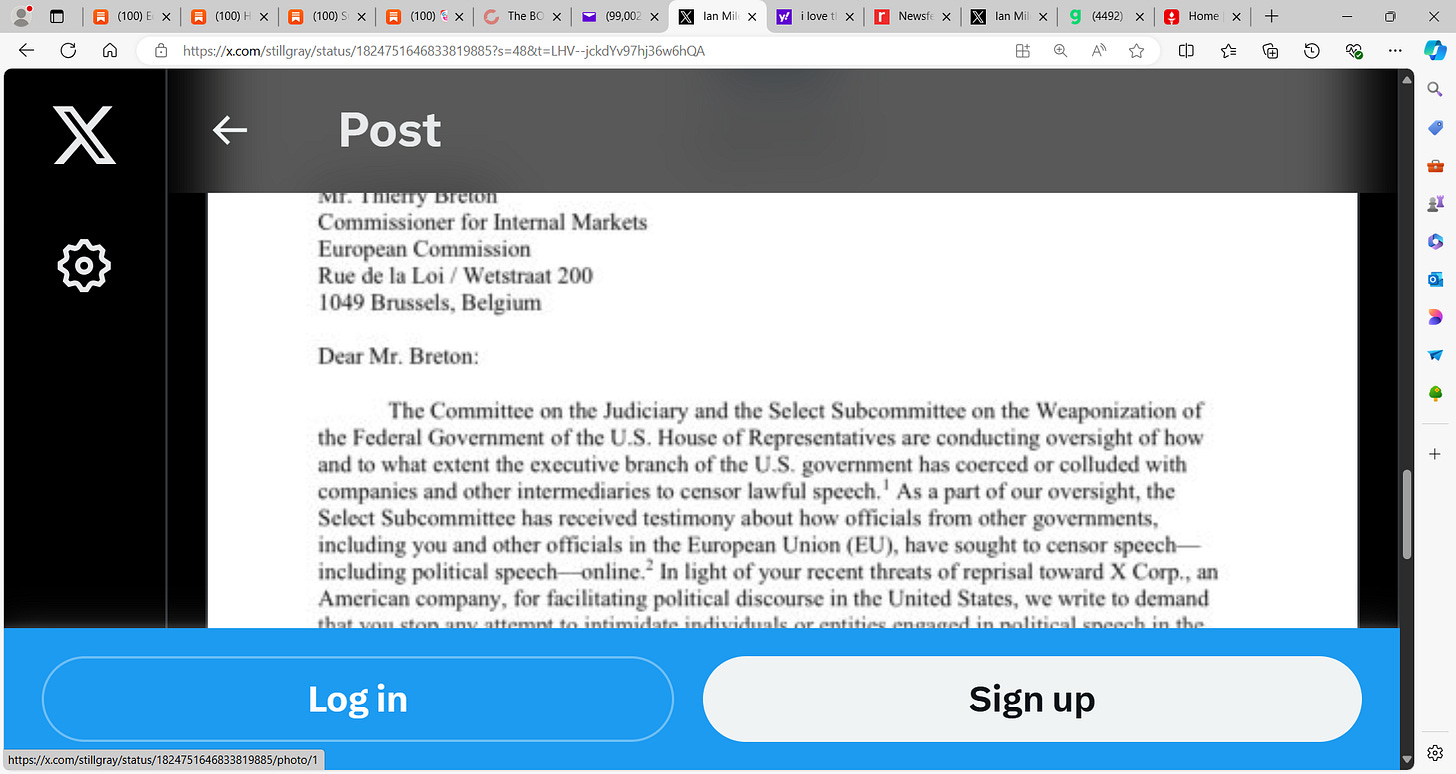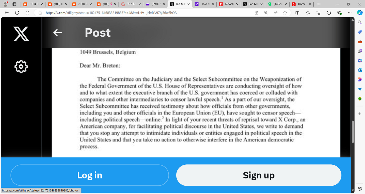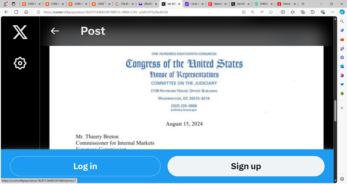 Breaking! up yours EU Commissioner Thierry Breton, up your arse sideways with Trudeau's, Romney's, & Walz's dildo! The U.S. House Judiciary Committee backs X & Elon Musk and defends free speech!