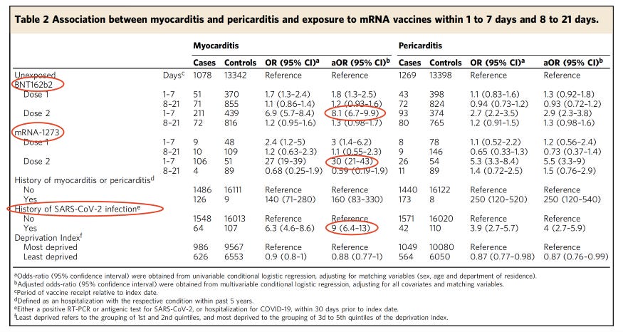 ‘We perform matched case-control studies and find increased risks of myocarditis and pericarditis during the first week following vaccination, and particularly after the second dose, with adjusted odds ratios of myocarditis of 8.1 (95% confidence interval [CI], 6.7 to 9.9) for the BNT162b2 and 30 (95% CI, 21 to 43) for the mRNA-1273 vaccine. The largest associations are observed for myocarditis following mRNA-1273 vaccination in persons aged 18 to 24 years.’
