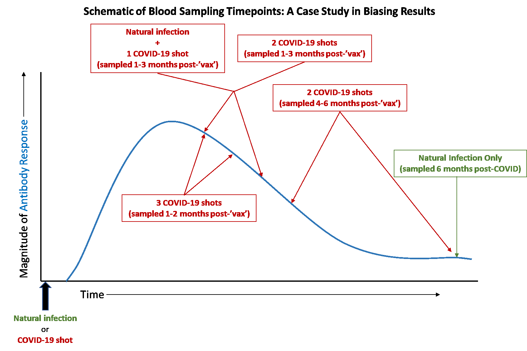 To be fair, blood sampling should have been done in all groups at the peak of each response, or at the end of the response when a plateau has been reached. As can be seen in the schematic below, blood sampling was done in a way that biased the results towards showing superior antibody responses against the spike protein in people that had received COVID-19 shots…