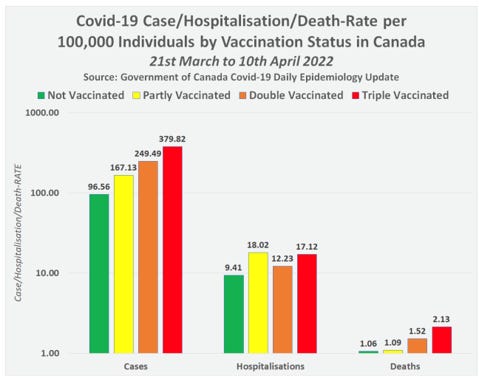 Canadian data in early 2022 showing the more vaccine one gets, the more doses, the more elevated the risk of infections, cases, hospitalizations, deaths; the data is clear! The COVID gene injection