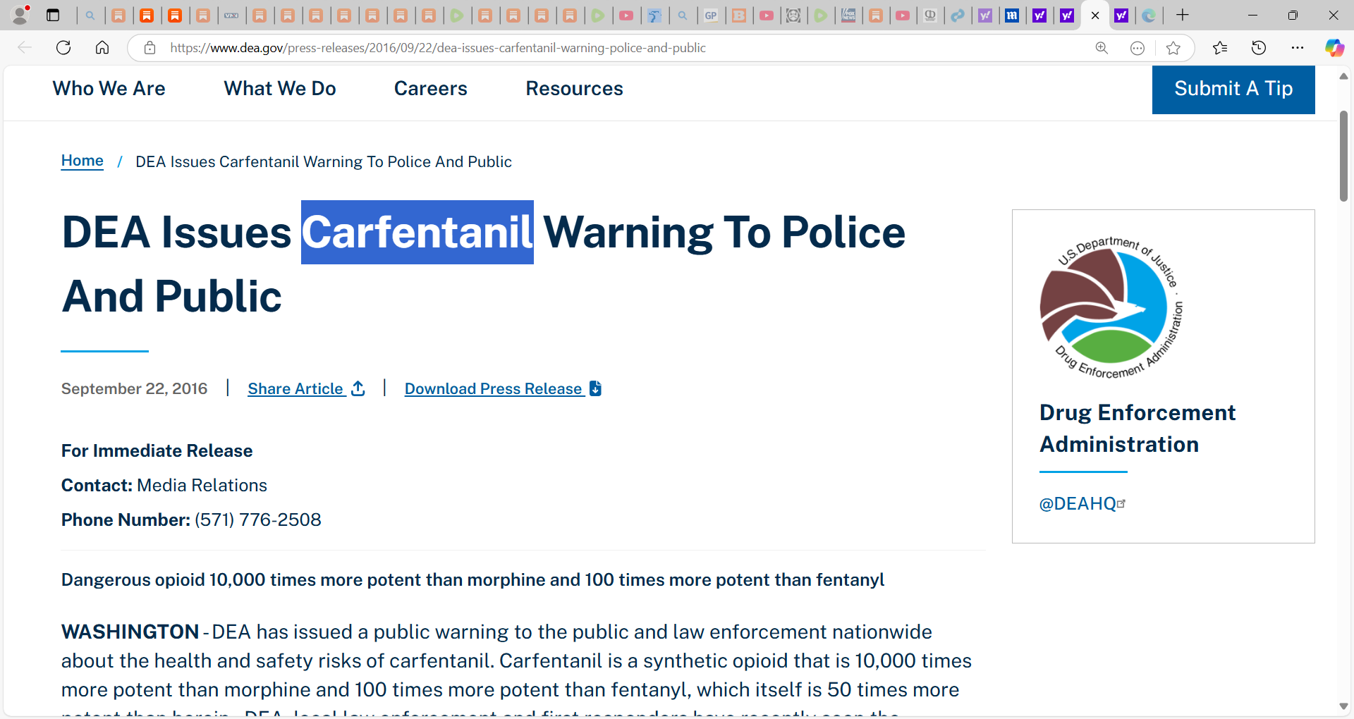 often CANNOT reverse overdose from carfentanil! It is used to take down huge animals with thick hide e.g. elephants, 100 times more potent than fentanyl and 10,000 times more potent than morphine.