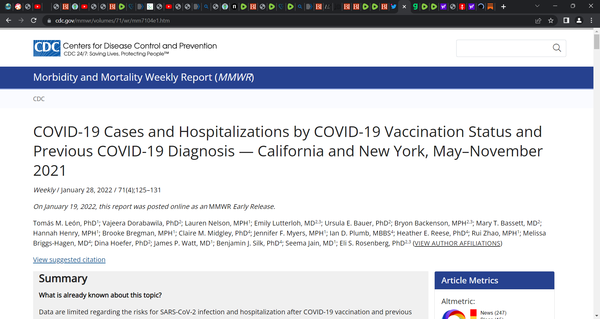 ‘By the week beginning October 3, compared with COVID-19 cases rates among unvaccinated persons without a previous COVID-19 diagnosis, case rates among vaccinated persons without a previous COVID-19 diagnosis were 6.2-fold (California) and 4.5-fold (New York) lower; rates were substantially lower among both groups with previous COVID-19 diagnoses, including 29.0-fold (California) and 14.7-fold lower (New York) among unvaccinated persons with a previous diagnosis, and 32.5-fold (California) and 19.8-fold lower (New York) among vaccinated persons with a previous diagnosis of COVID-19. During the same period, compared with hospitalization rates among unvaccinated persons without a previous COVID-19 diagnosis, hospitalization rates in California followed a similar pattern.