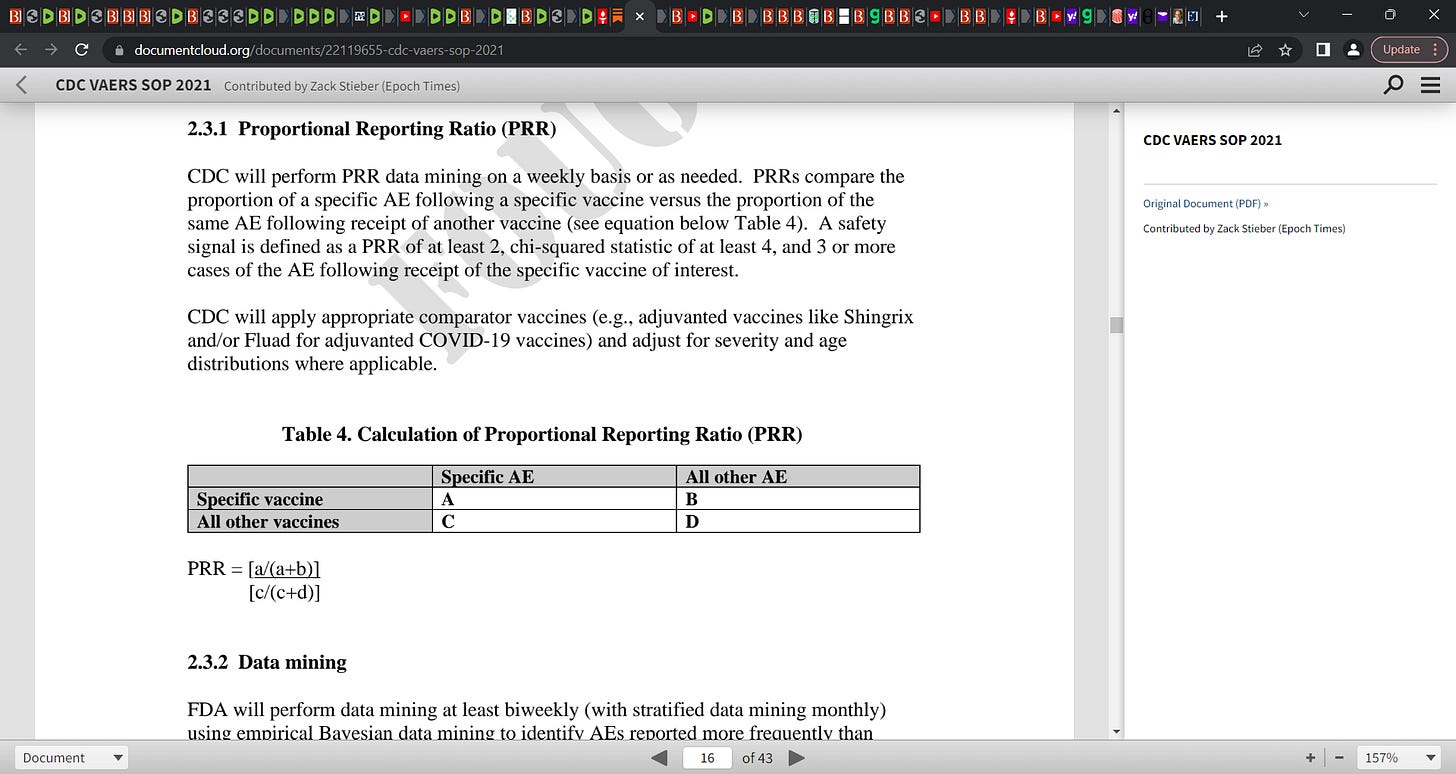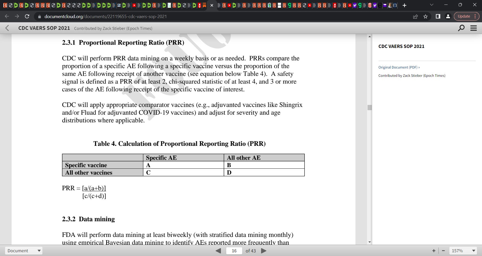 That contradicts the operating procedures, which state that the CDC “will perform Proportional Reporting Ratio (PRR) analysis” on VAERS reports.