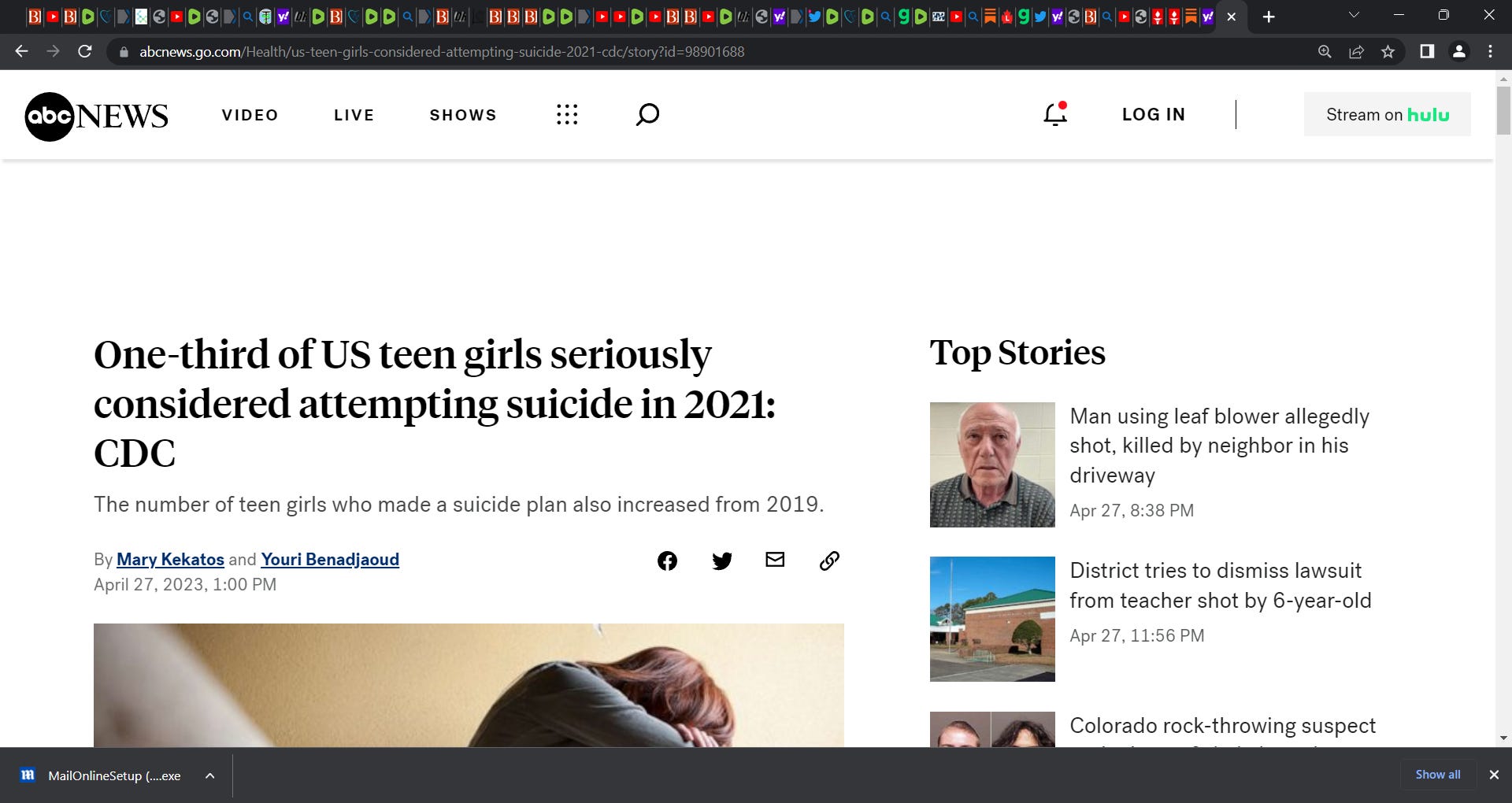 'CDC reports that One-third of US teen girls seriously considered attempting suicide in 2021: The number of teen girls who made a suicide plan also increased from 2019'; this is very troubling