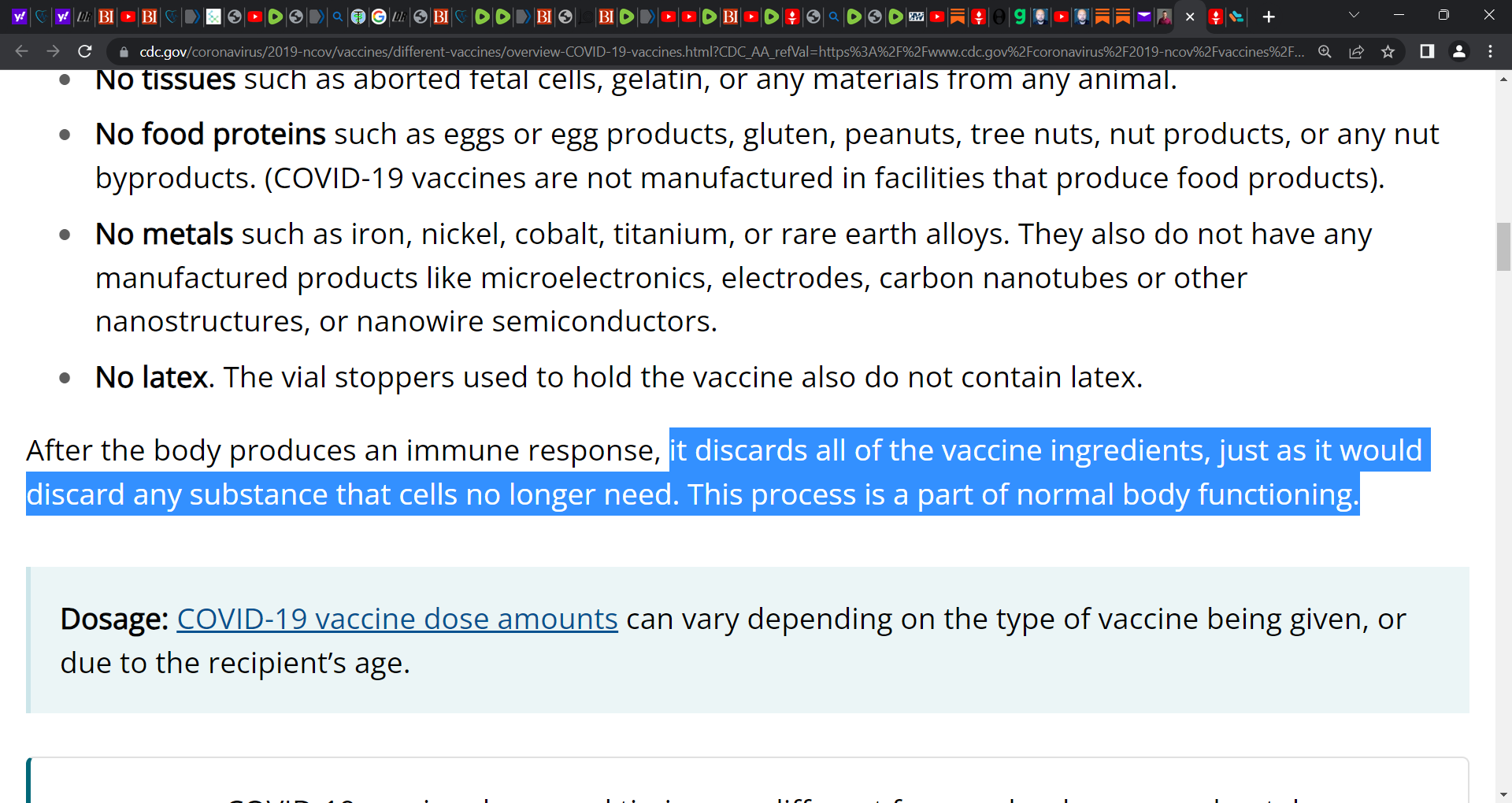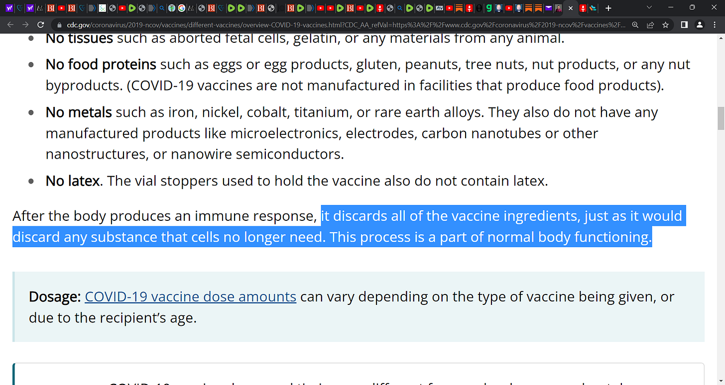 discarded from the body; what two utter lies & tripe garbage drivel! We know does not stay at injection site, it is unsafe, reverse transcribed, is not dissolved (mRNA) soon after, 0DNA plasmids etc.