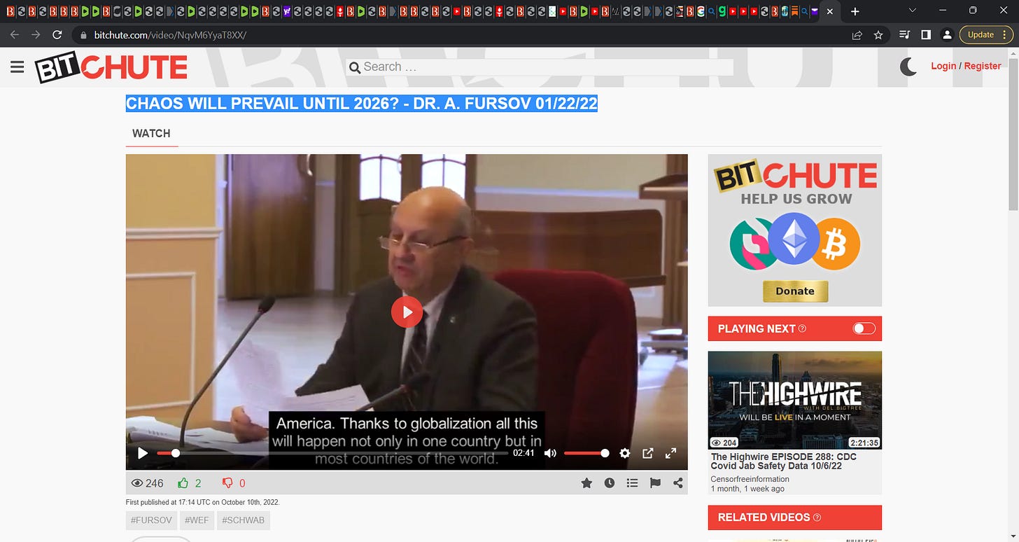 Interesting lecture. Went a little fast reading subtitles, no time to stop and think “is that true?” Certainly Dr. Fursov’s assessment of the low intellectual bar of Western leadership strikes home. The destruction of the middle class by bankrupting small business is a reality but I’m not at all sure this is irreversible as shipping costs and energy consumption with drive local production and local ROA. In fact a comeback is both necessary and inevitable. Conclusions based on general principles sound good, but these are economic principles, not laws of physics. I believe he is right that Schwab will go to the dustbin and his reasons are correct because the world is following the dialectic laid out that various writers proposed as fundamental truths that the elite have swallowed. Russia will be the wrench in his plans. But there are new truths the old thinkers were ignorant of. The key is preservation of our Constitution. The elites are only capable of linear thinking which spawns the various scenarios that come and go as described. Why? Because the elite, impaired in their own ways, follow the playbooks they believe in. Look at what a pathetic moron Gates is, but he imposes his stupidity on the planet through his vast wealth, and how enthralled all the other elitists are with it. They do not grasp nonlinear solutions that exist. There will be a new elite that is more a guide than an elite: an educated and capable underclass with no private jets but with a different vision...and we will win. IF we preserve our Constitution. Getting rid of the Medical shit is step #1, with protection of the human brain from conception onward at all cost as the driving principle. The idiots running our medical industry never heard of it. So they reproduce 1 out of 3 autistics. The jig is up.