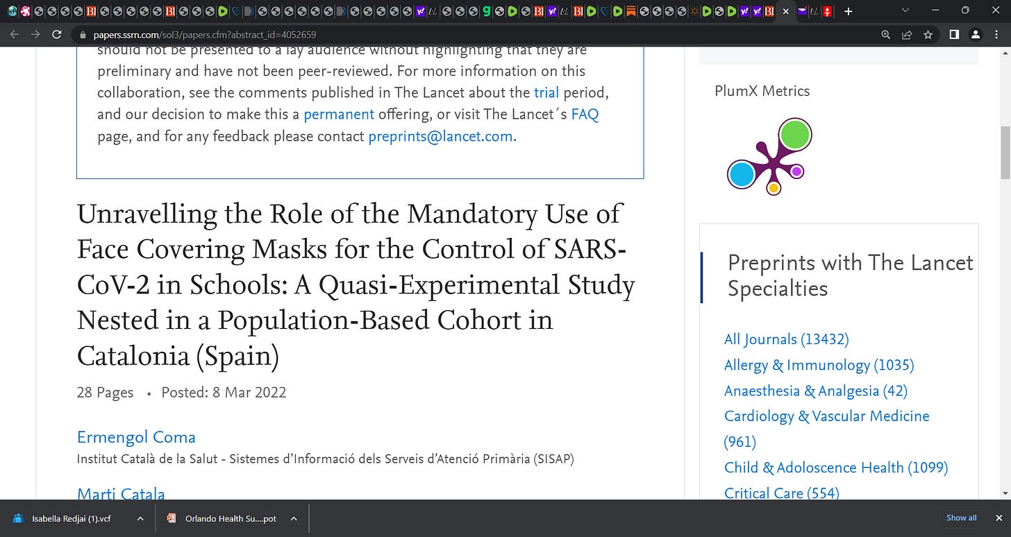 Children face mask study Catalonia Spain (it's in my Brownstone op-ed) but a key study so look it: "Unravelling the Role of the Mandatory Use of Face Covering Masks for the Control of SARS-CoV-2