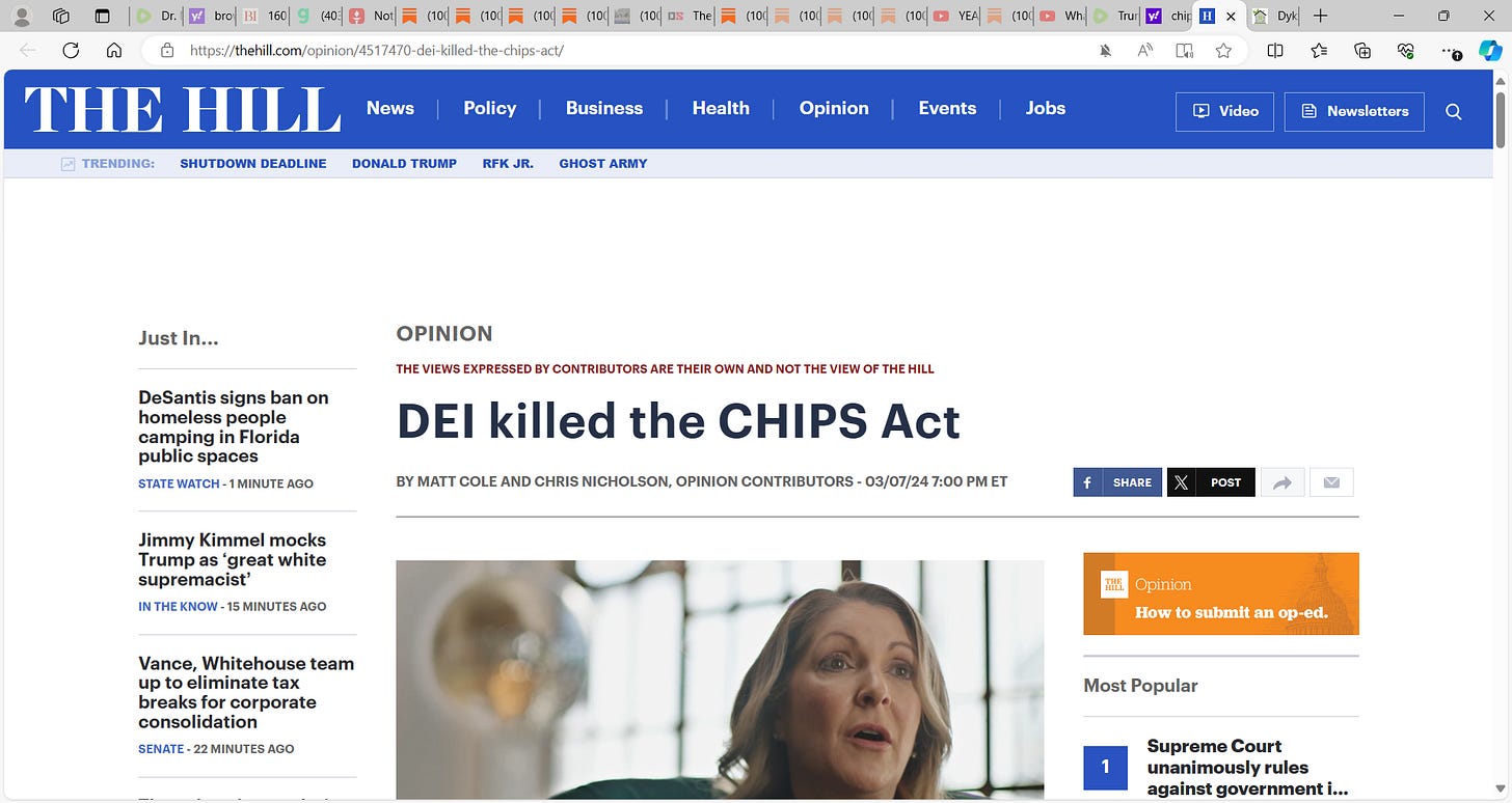 has now taken us to a place that we will likely regret. Why? Because DEI has killed the CHIPS Act. Our dependence on Taiwan’s semi-conductors remains a national security threat IMO. This opinion piece in The HILL by MATT COLE AND CHRIS NICHOLSON is worth the read for it helps you understand what is at stake.