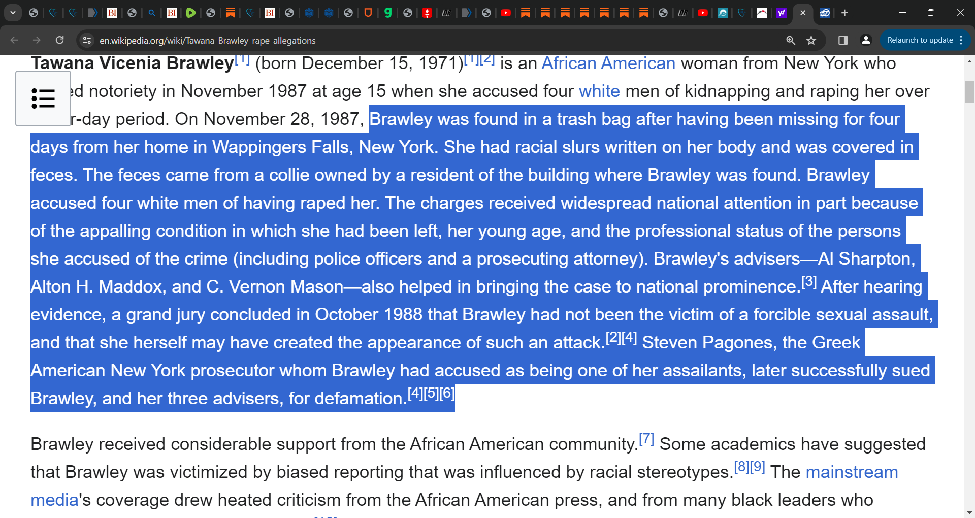 ‘In 1987, 15-year-old Tawana Brawley claimed she'd been abducted and raped by a group of white men in Dutchess County, New York. Brawley, who is African American, was found by police with the letters "KKK" written on her chest and a racial epithet written on her stomach. She told her lawyers that two of the assailants were law enforcement officials.