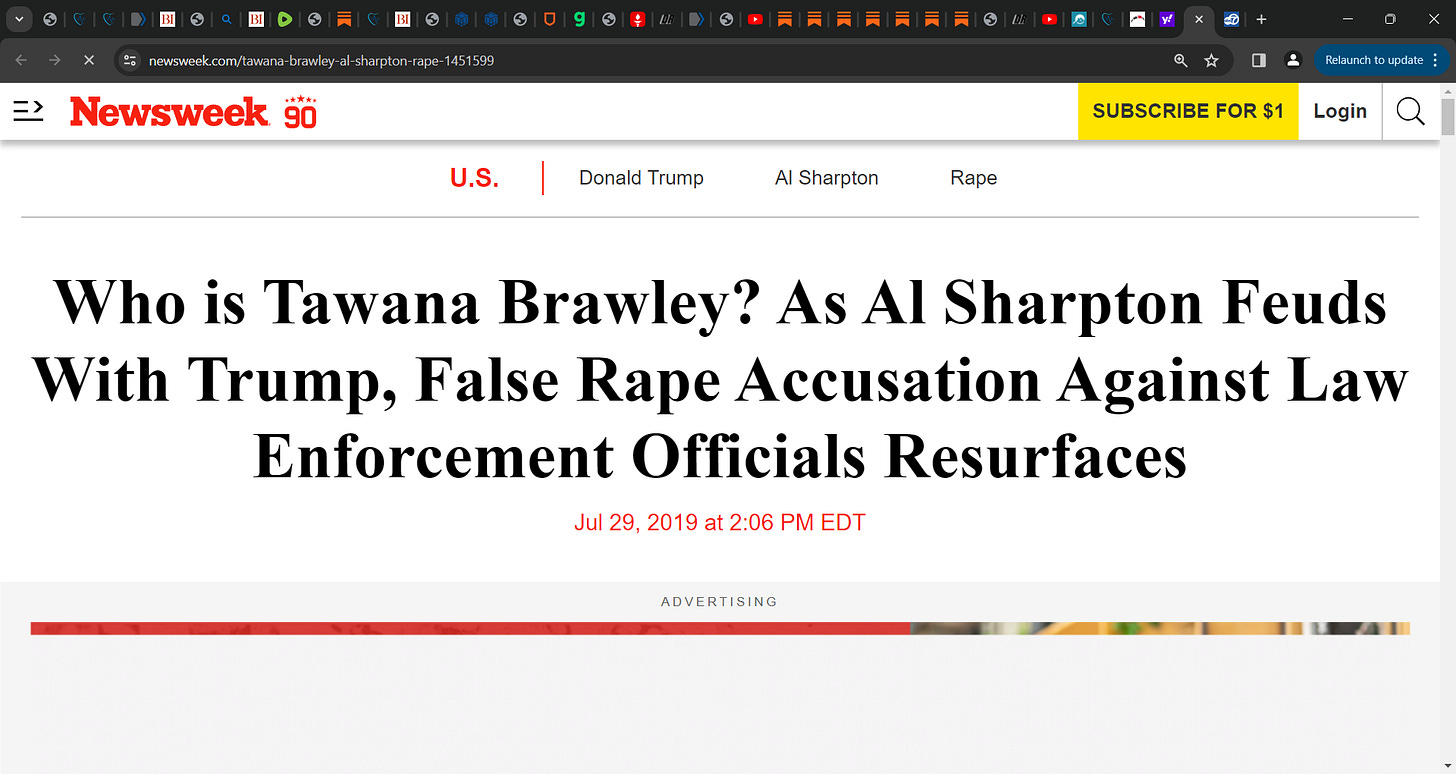 ‘But the incident turned out to be a hoax: After seven months of investigation, including over 6,000 pages of testimony by 180 witnesses, a grand jury found that Brawley had lied about the attack. Six months after the trial, he former boyfriend told reporters she invented the allegations’…
