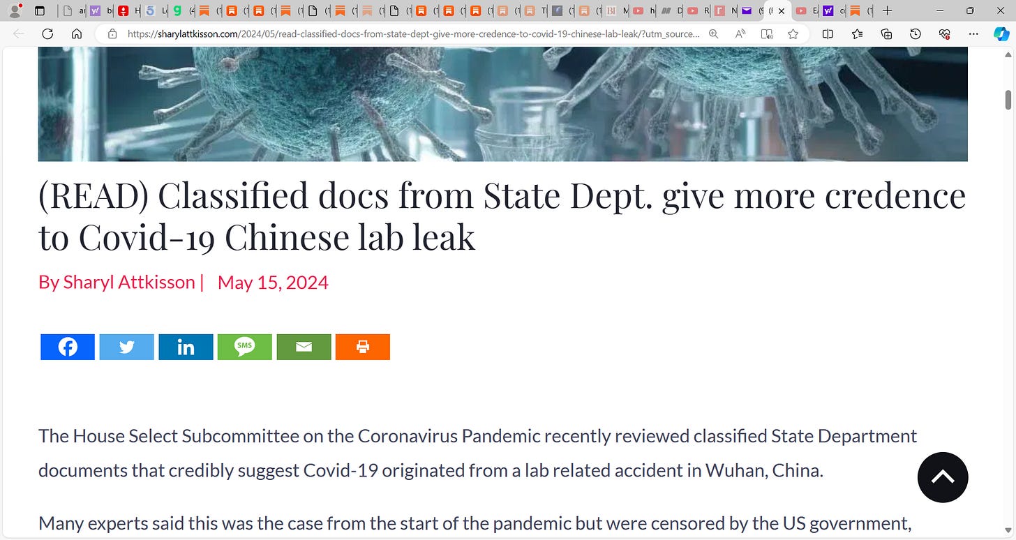 'Classified docs from State Dept. give more credence to Covid-19 Chinese lab leak' (Sharyl Attkisson); excellent reporting by Attkisson as usual but the lab leak IMO is bullshit, MISDIRECTION, a CON