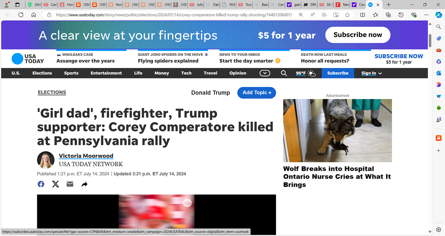 "We lost a fellow Pennsylvanian last night ... I just spoke to Corey's wife and his two daughters. Corey was a girl-dad. Corey was a firefighter. Corey went to church every Sunday. Corey loved his community. Corey loved his family. He was an avid supporter of the former president and so excited to be there last night with him in the community," Shapiro told the outlet.’
