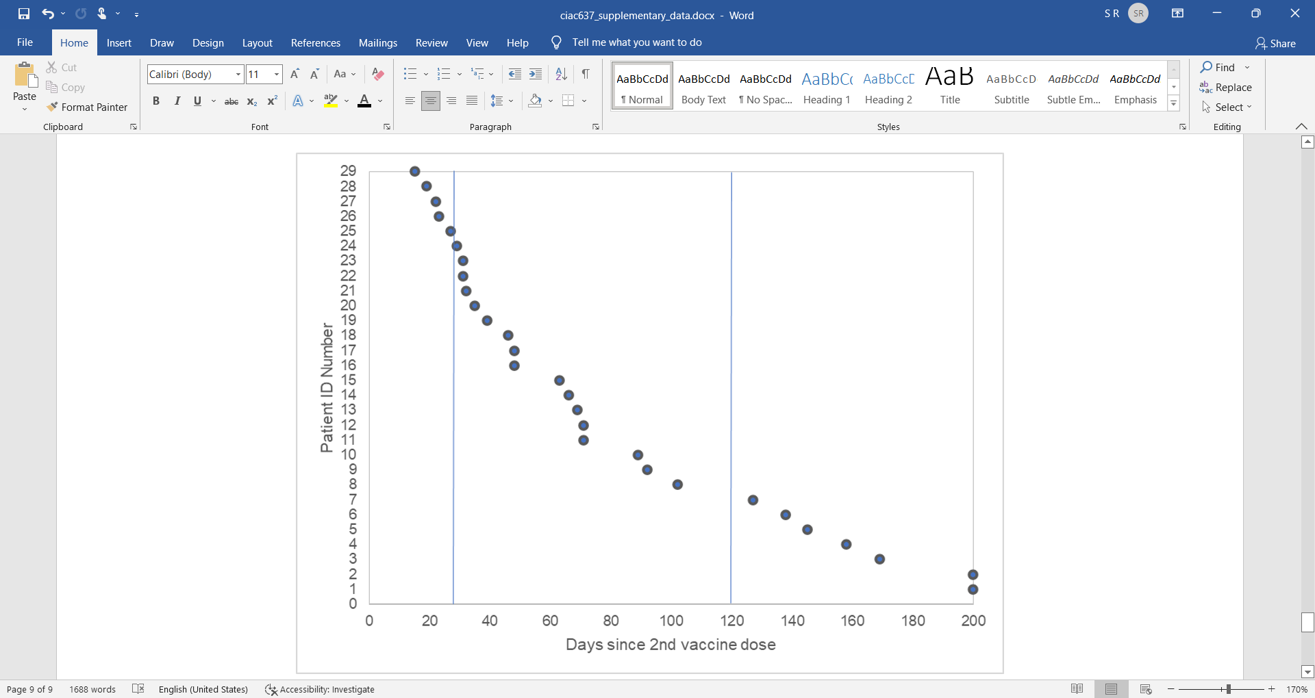 Supplemental Figure 2. Number of days from the 2nd BNT162b2 vaccine dose to hospitalization for 29 patients considered fully vaccinated, defined as having received their 2nd dose at least 14 days prior to illness. Two vertical lines delineate the 28 day timepoint, which was used as the primary timepoint for this analysis, and the 120 day timepoint, which was used to assess waning immunity.