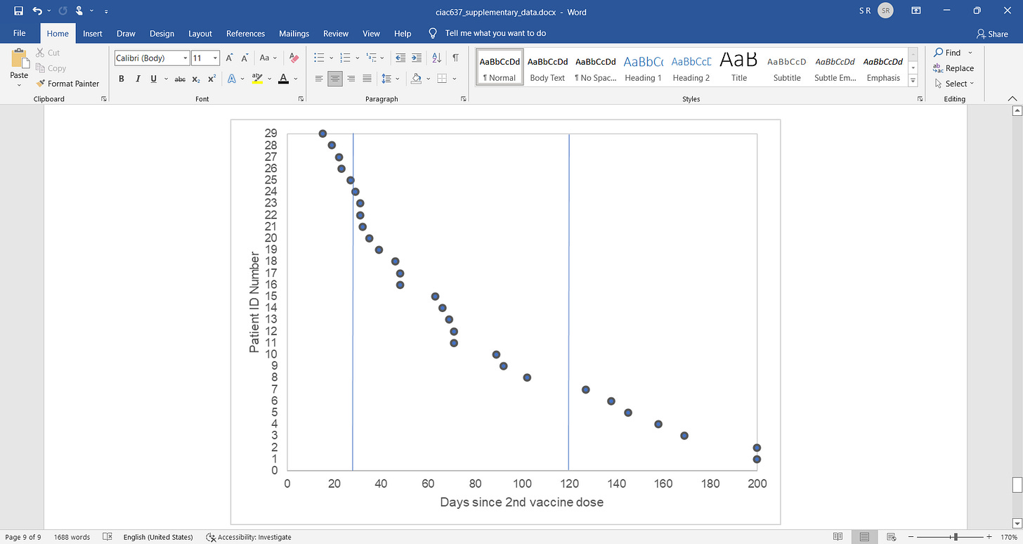 Yet this graph is non-sensical and Igor is correct in focusing here. It shows not what they want it to show in case you were not looking closely. It actually shows that most of the MIS-C occurs soon after vaccination which is in line with what we see in VAERS where most adverse effects and deaths accumulate post COVID shot (1-10 days or so post shot). You would think over time with declining vaccinal protection (waning immunity) as we know occurs with these mRNA vaccines, that most MIS-C cases would accumulate in the lower right part of the graph (less in the upper left as the vaccine would be assumed to be providing protection there and more in the lower right as immunity wanes).