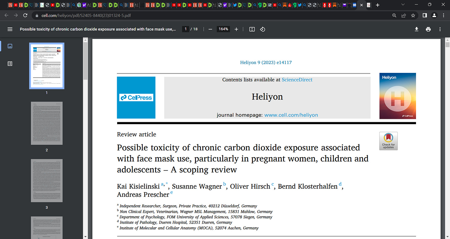 ‘Fresh air has around 0.04% CO2, while wearing masks more than 5 min bears a possible chronic exposure to carbon dioxide of 1.41% to 3.2% of the inhaled air. Although the buildup is usually within the short-term exposure limits, long-term exceedances and consequences must be considered due to experimental data. US Navy toxicity experts set the exposure limits for submarines carrying a female crew to 0.8% CO2 based on animal studies which indicated an increased risk for stillbirths.