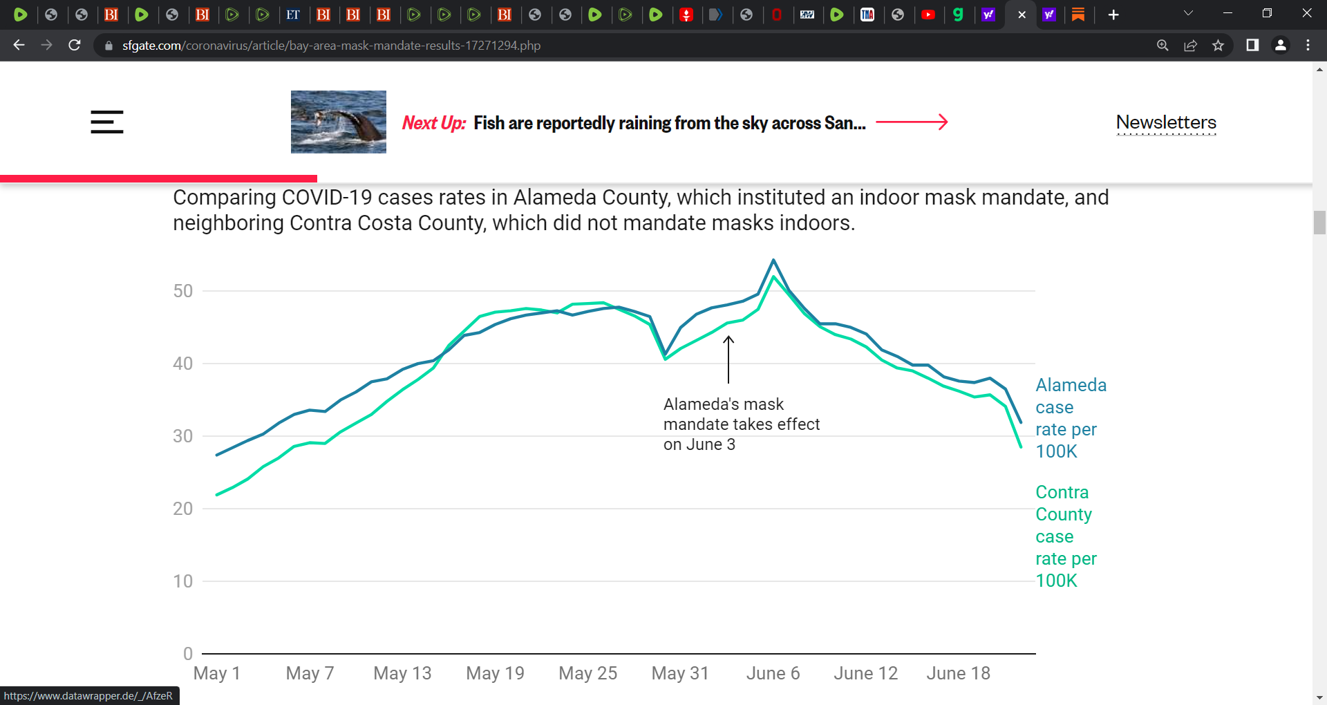 The case rate curves for Alameda (indoor mask mandate) and Contra Costa (no indoor mask mandate) counties are near-identical.