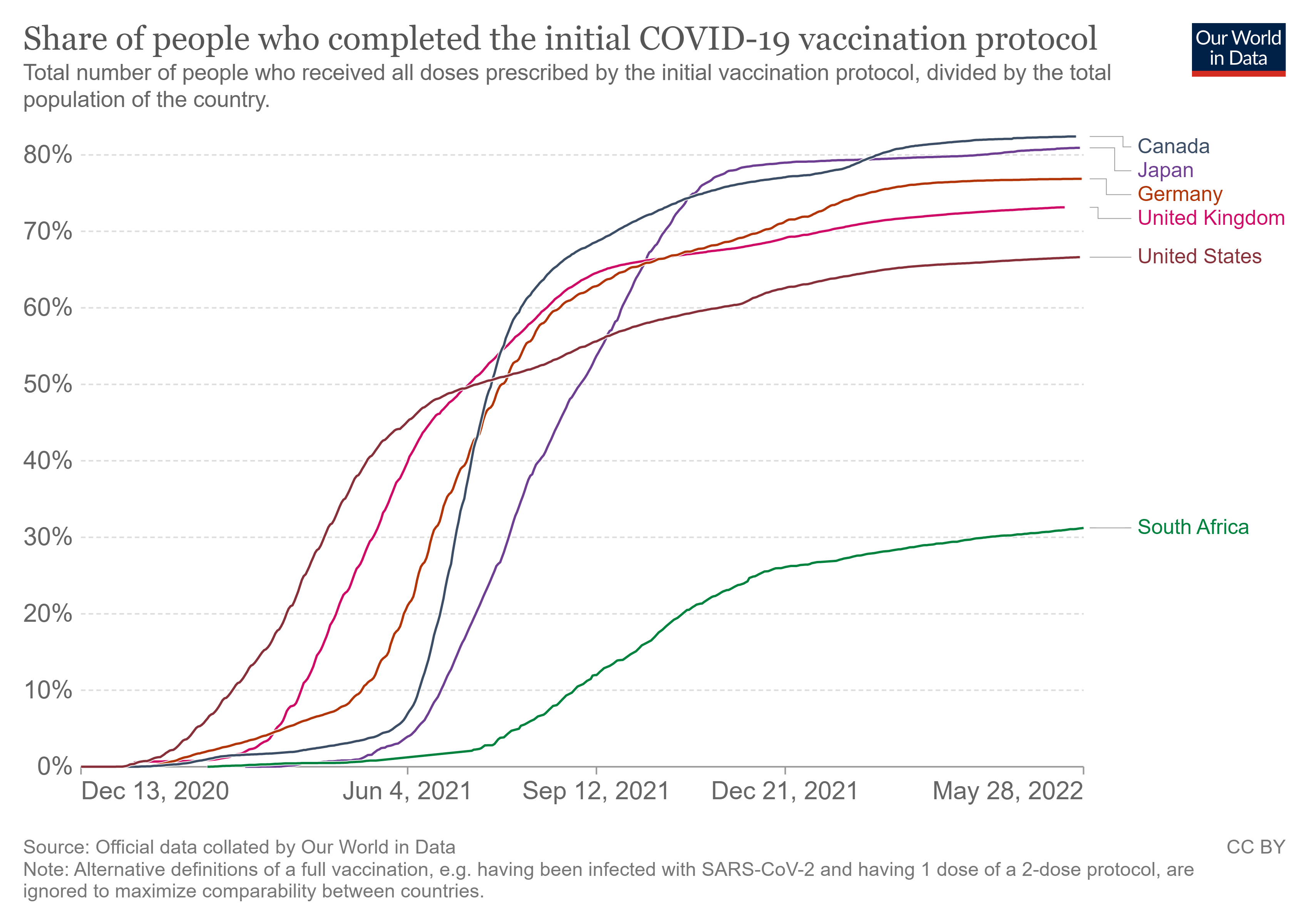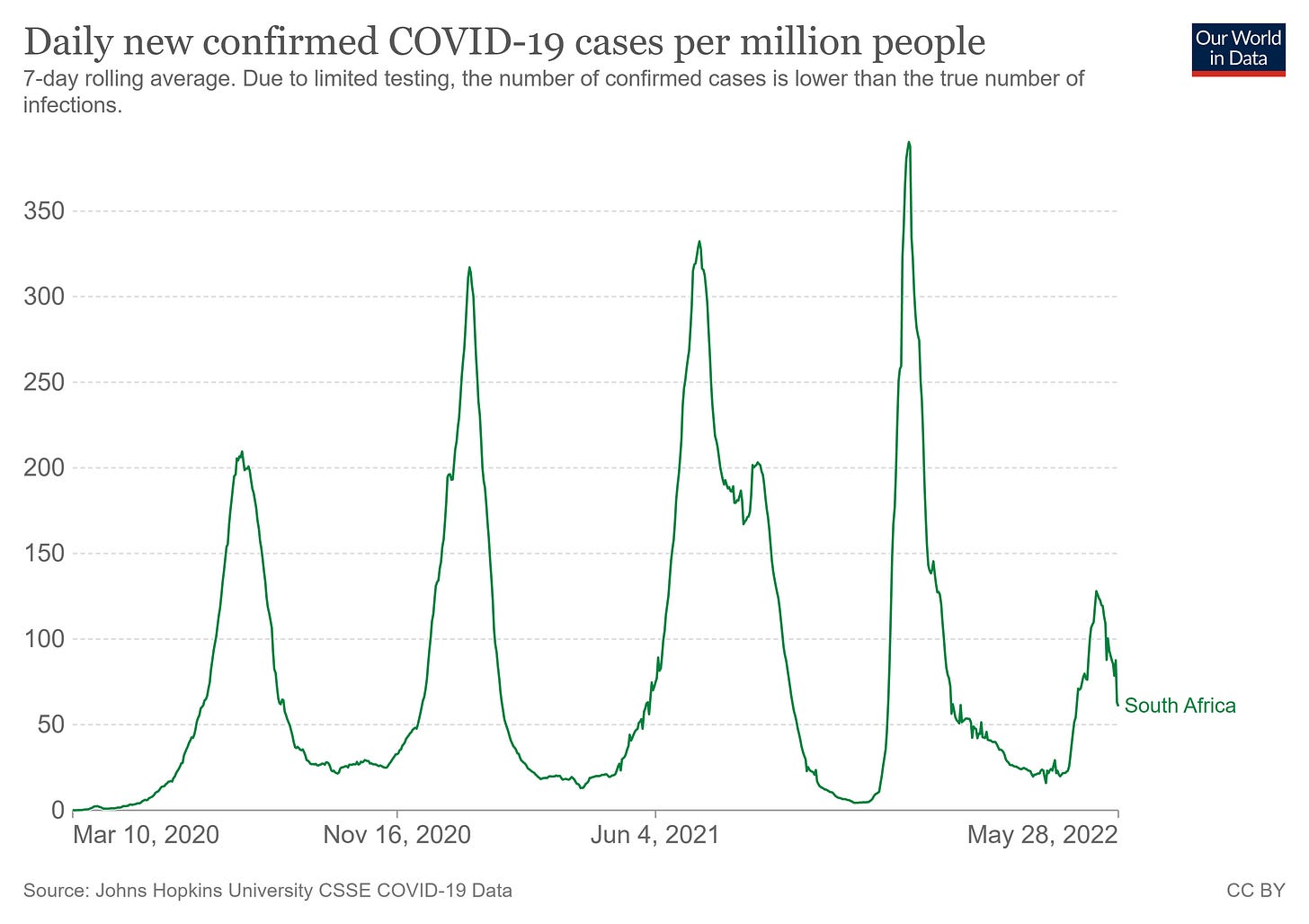 South Africa infection/cases, note we can see the waves get higher per successive wave, does not return to baseline, and more rapid curves etc. South Africa is one of the least vaccinated nations on earth, see 2nd graph.