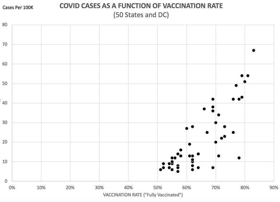Vaccination rate by COVID cases per 100,000 in 50 US states, data from the NY Times COVID tracker.