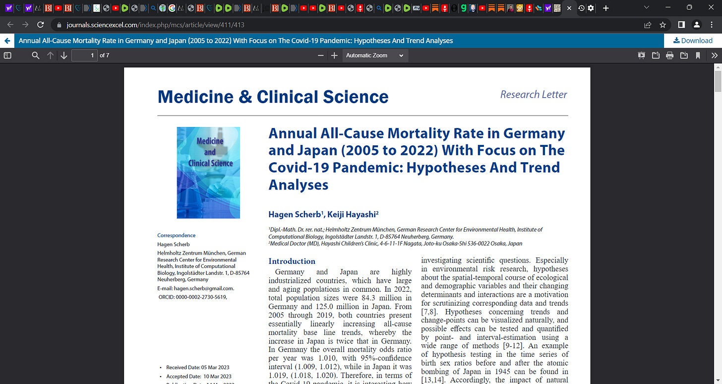‘“Annual All-Cause Mortality Rate in Germany and Japan (2005 to 2022) with Focus on the Covid-19 Pandemic: Hypothesis and Trend Analyses,” is a letter in the journal Medicine and Clinical Science by Hagen Scherb and Keiji Hayashi, comparing mortality trends across these two “highly industrialised countries, which have large and ageing populations in common.” It’s the first piece I know of to look closely at pandemic-era mortality trends in Japan – a country which provides a useful control on many fronts, because it took a relatively relaxed approach to non-pharmaceutical interventions, like many other Asian jurisdictions never saw much Covid mortality, and yet since Fall 2021 has a substantially higher vaccination rate than Germany.