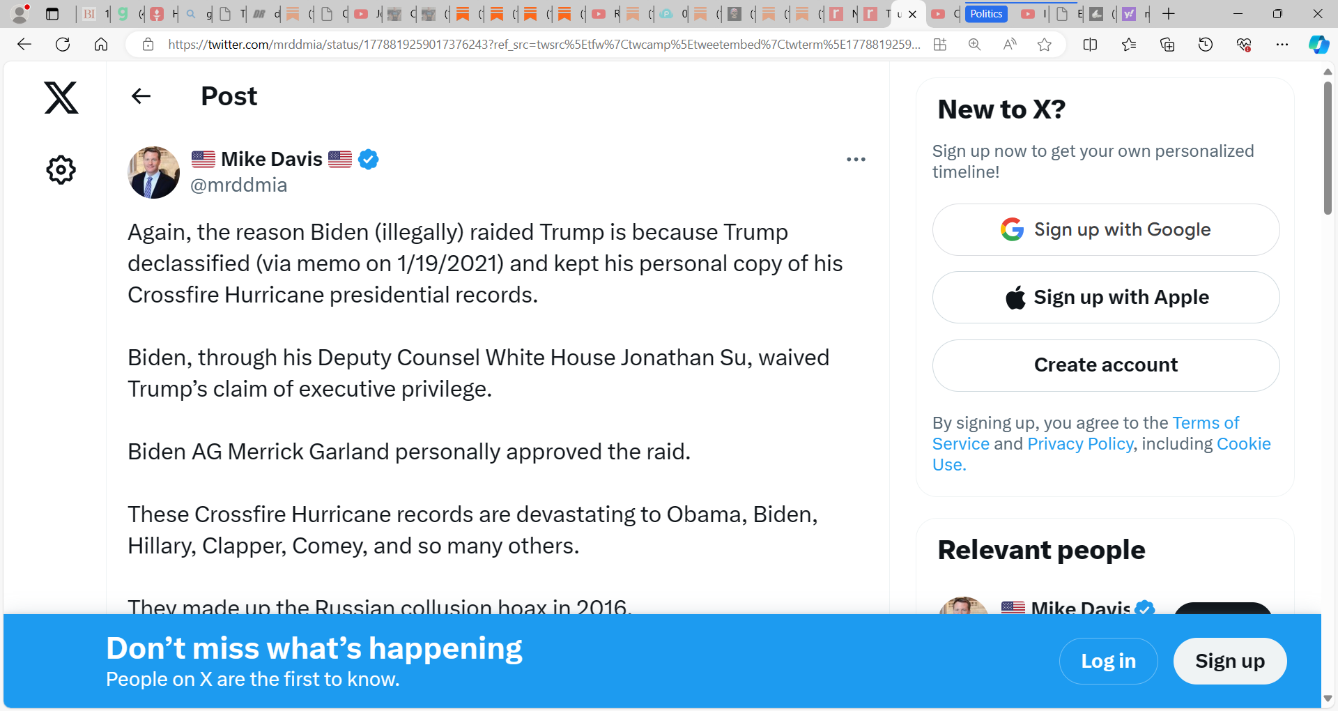 ‘Again, the reason Biden (illegally) raided Trump is because Trump declassified (via memo on 1/19/2021) and kept his personal copy of his Crossfire Hurricane presidential records. Biden, through his Deputy Counsel White House Jonathan Su, waived Trump’s claim of executive privilege. Biden AG Merrick Garland personally approved the raid.