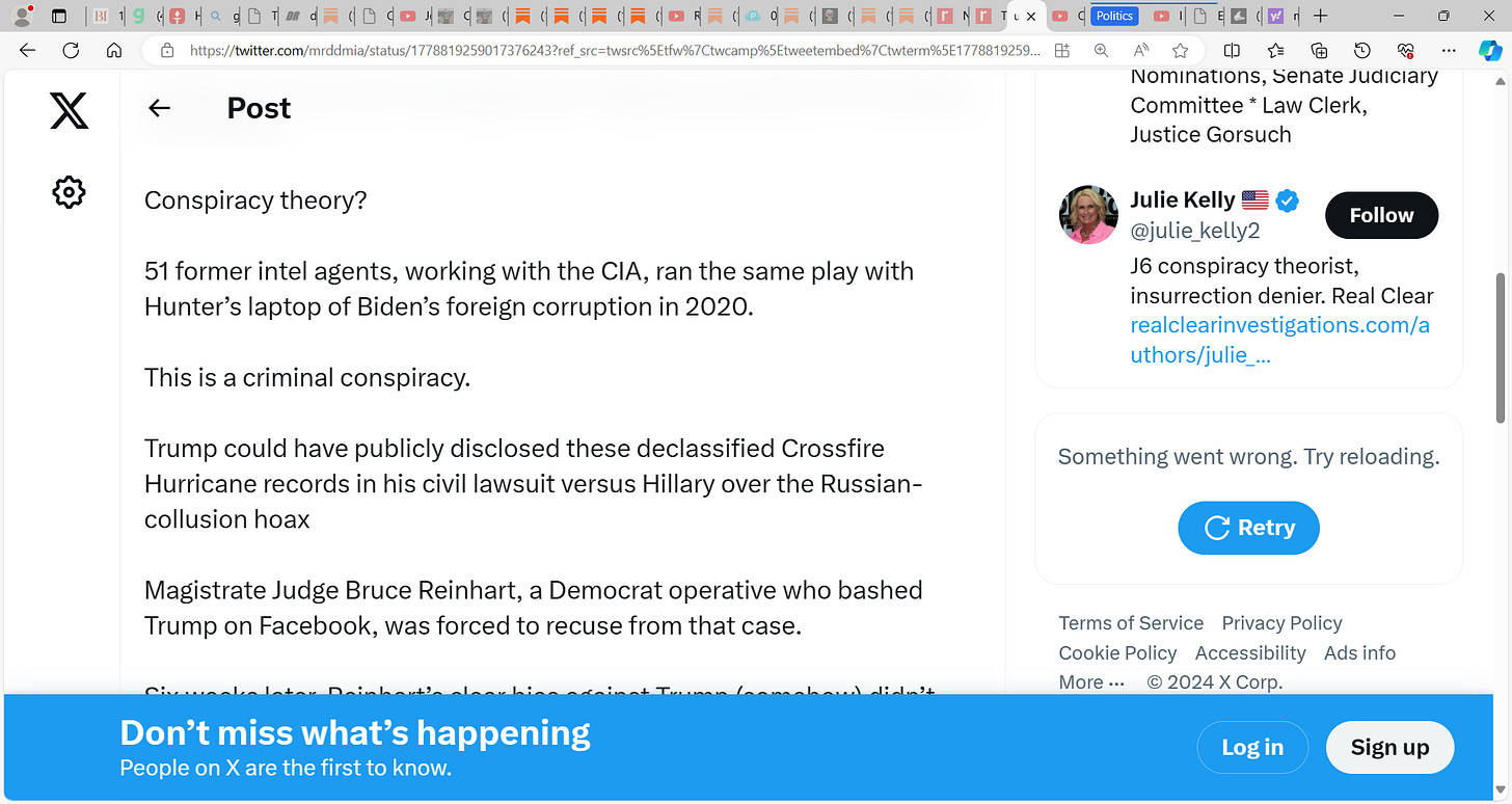 Conspiracy theory? 51 former intel agents, working with the CIA, ran the same play with Hunter’s laptop of Biden’s foreign corruption in 2020. This is a criminal conspiracy. Trump could have publicly disclosed these declassified Crossfire Hurricane records in his civil lawsuit versus Hillary over the Russian-collusion hoax Magistrate Judge Bruce Reinhart, a Democrat operative who bashed Trump on Facebook, was forced to recuse from that case. Six weeks later, Reinhart’s clear bias against Trump (somehow) didn’t matter anymore.
