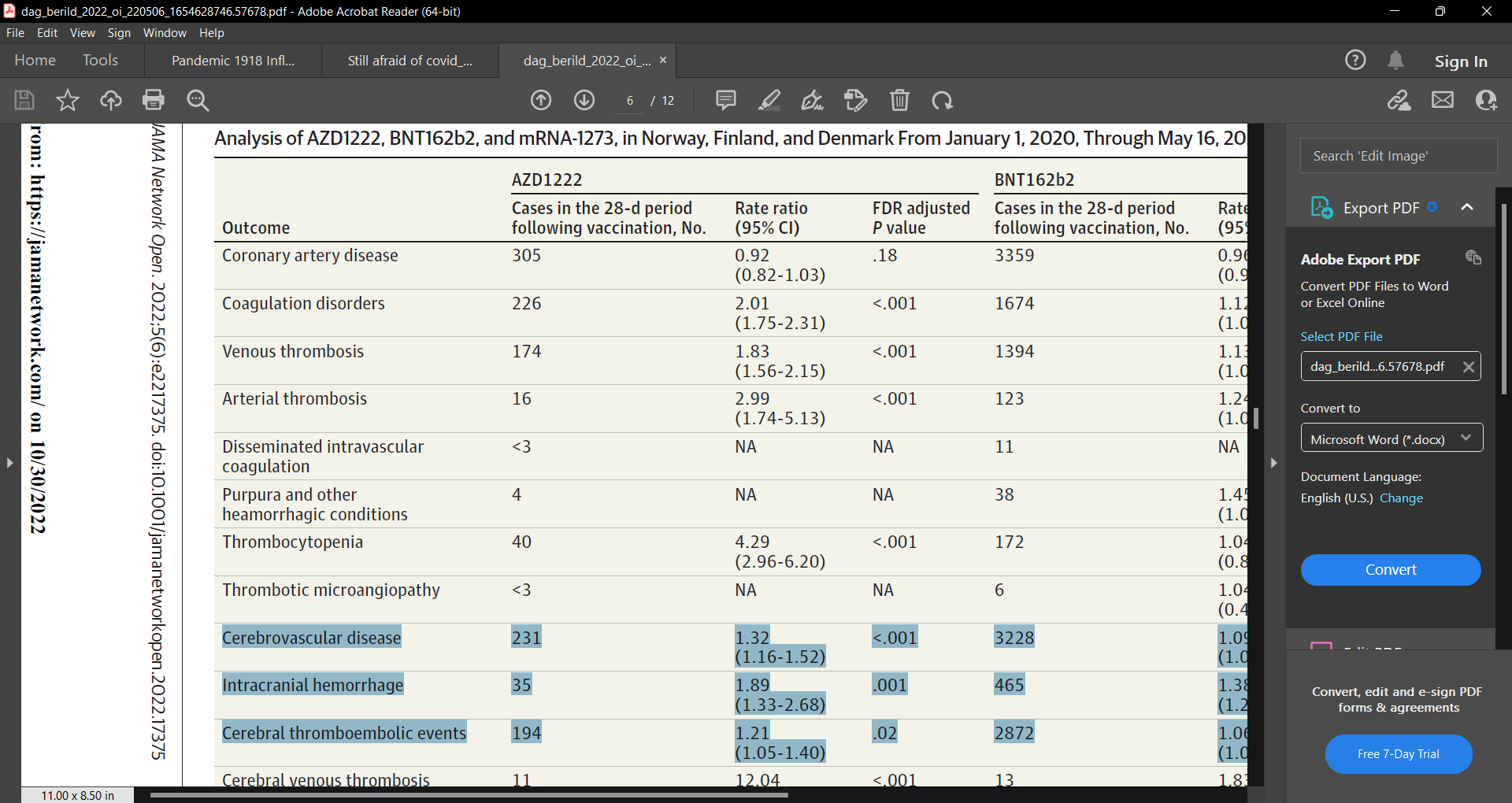 For individual diseases within the main outcomes, 2 notably high rates were observed: 12.04 (95% CI, 5.37-26.99) for cerebral venous thrombosis and 4.29 (95% CI, 2.96-6.20) for thrombocytopenia, corresponding to 1.6 (95% CI, 0.6-2.6) and 4.9 (95% CI, 2.9-6.9) excess events per 100 000 doses, respectively, following AZD1222 vaccination.’