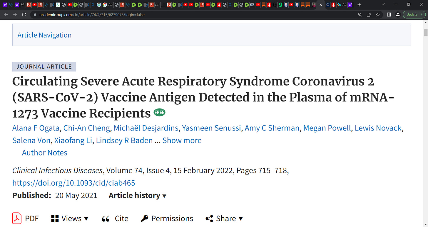Dangerous spike protein (and subunit S 1) circulates widely in the body after vaccination? Yes! Doing massive damage? Yes! Ogata et al. showed us this in 2022: 11 participants exhibit S1 antigen in