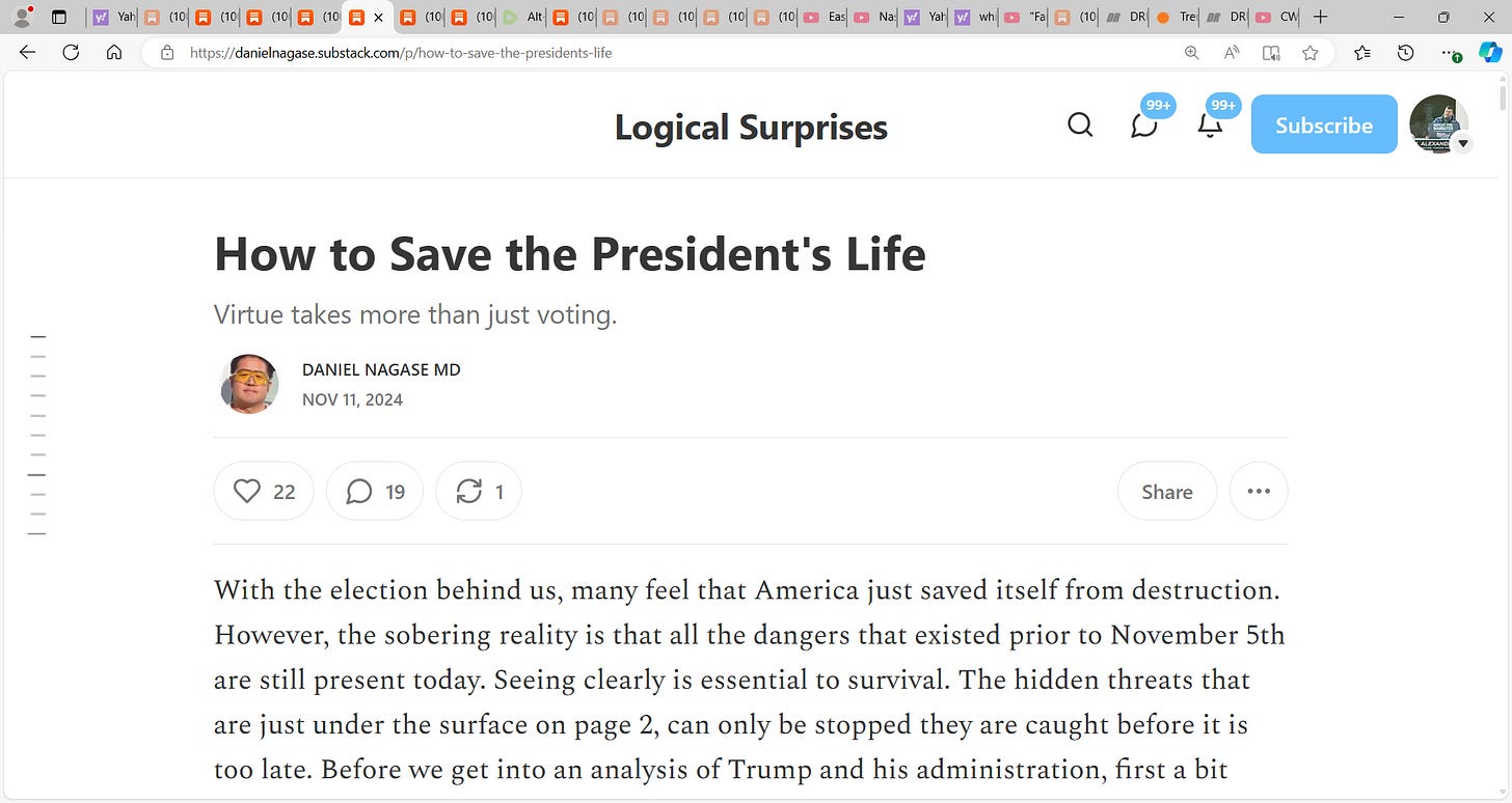 Daniel Nagase MD excellent stack "How to save the President's Life"; 'Take Robert Malone for example. Early on he made a name for himself as the “Inventor” of mRNA technology who became a truther