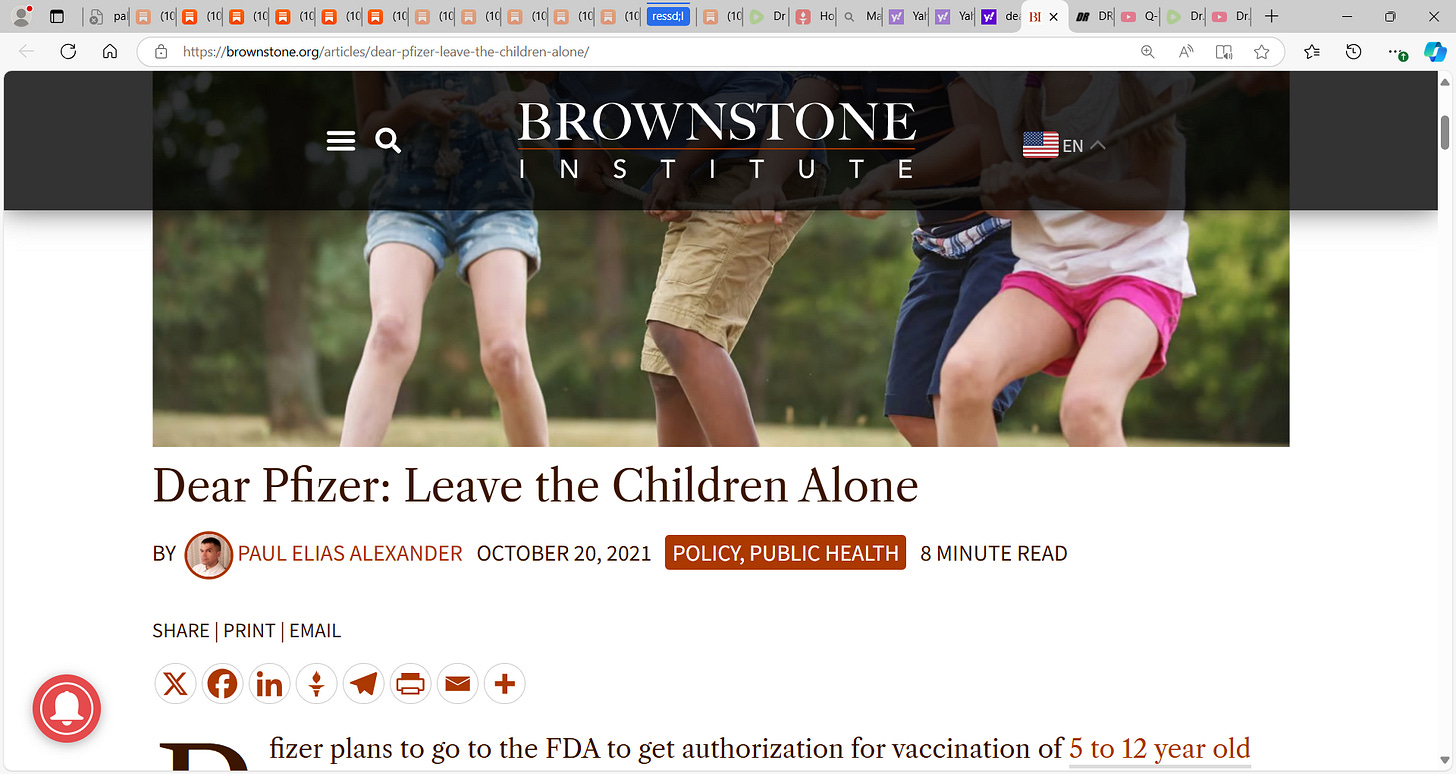 'Dear Pfizer: Leave the Children Alone Brownstone Institute'; recall this paper I wrote 3 years ago, clarion call to Pfizer to not push the Malone Sahin Kariko Bancel Bourla et al. mRNA vaccine on