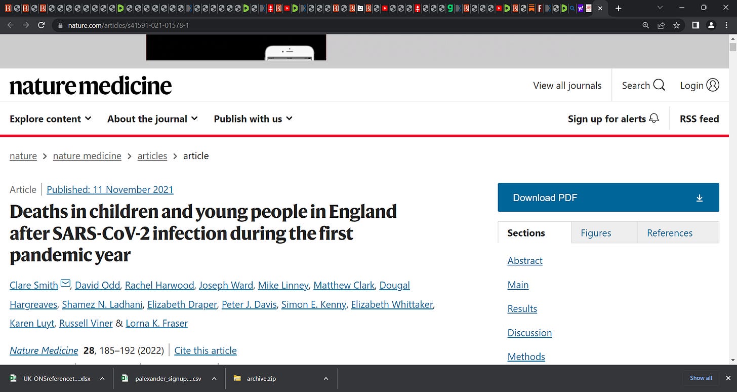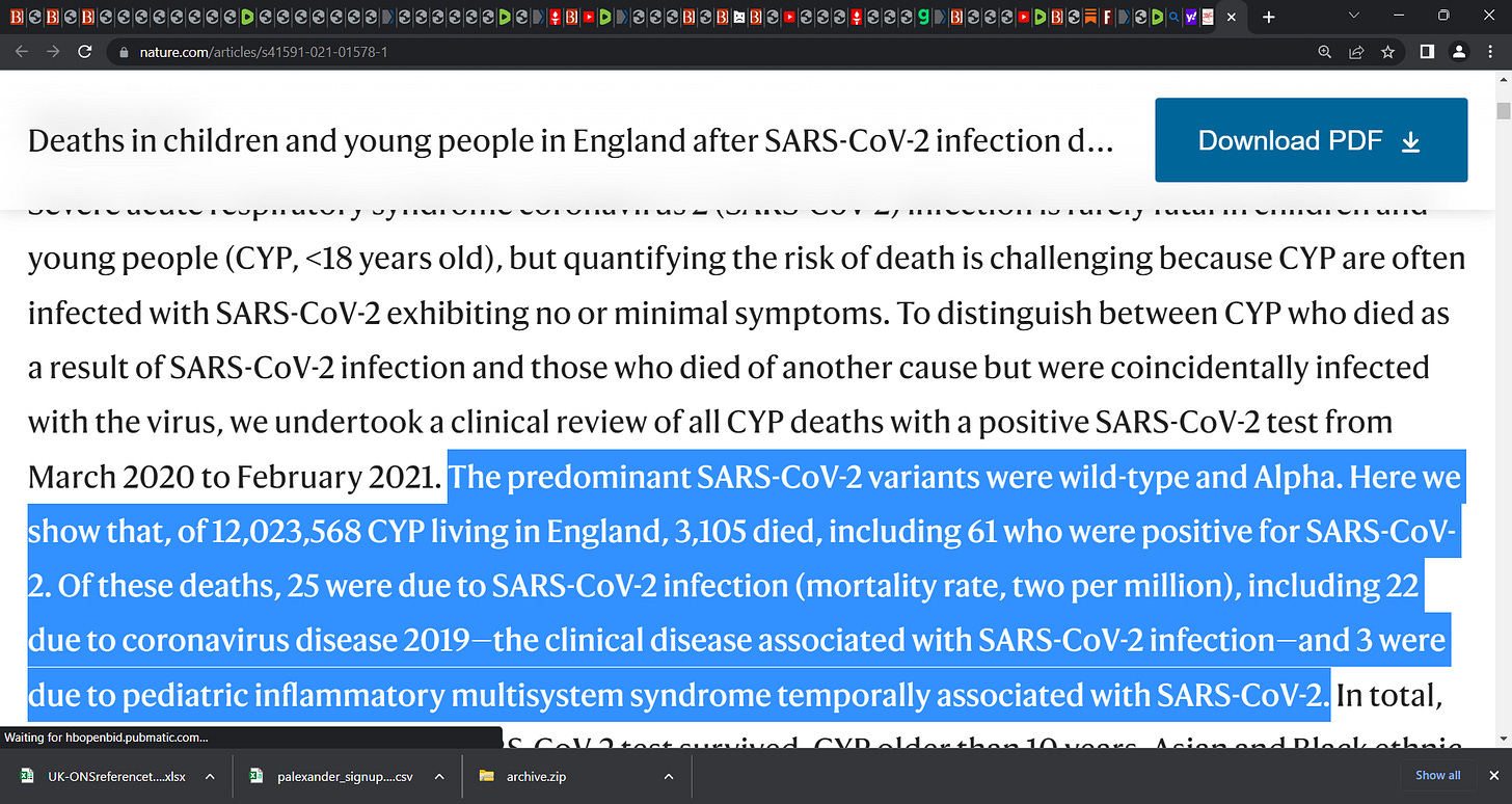 "Deaths in children and young people in England after SARS-CoV-2 infection during the first pandemic year", published in NATURE in 2021, showing of 12,023,568 children & young persons in England...